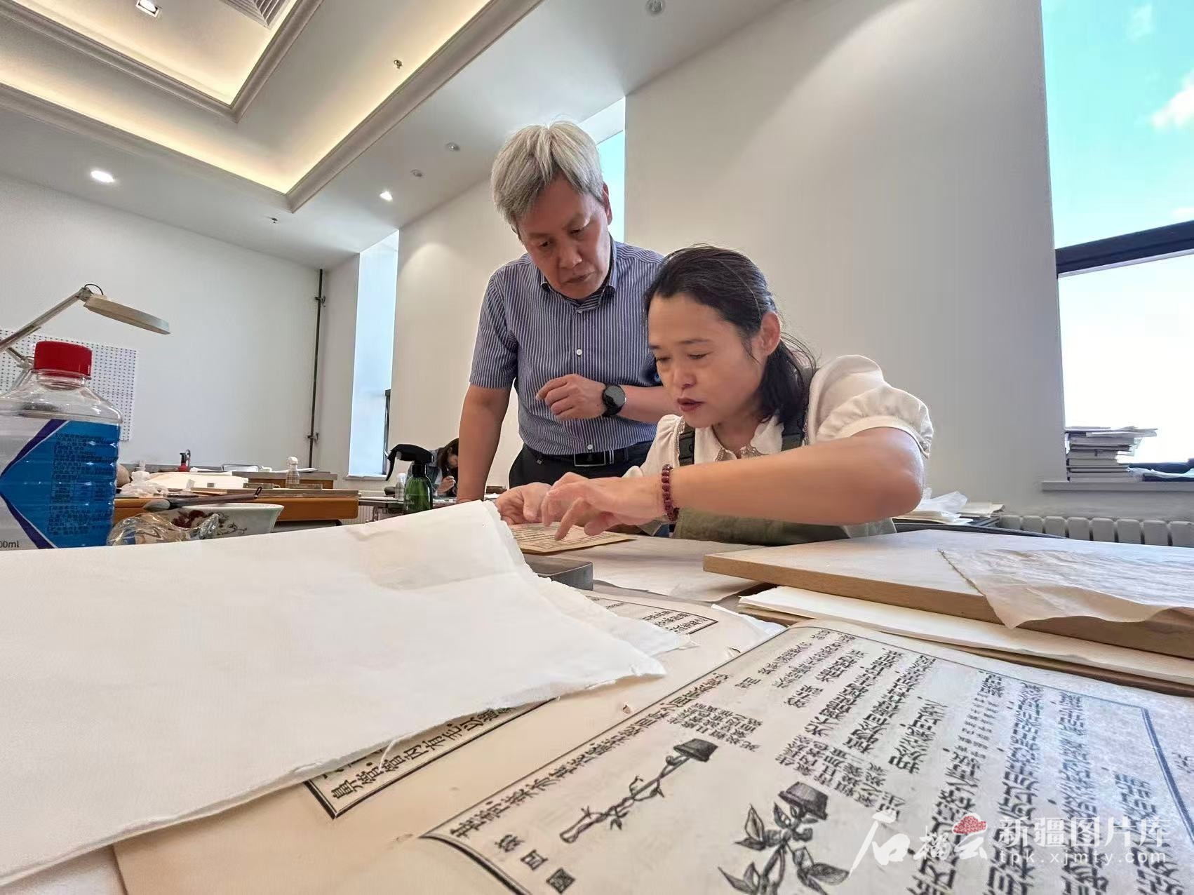 8月14日,晨光透过窗户洒落在新疆图书馆三楼的国家级古籍修复技艺传习中心——新疆传习所,古籍修复师张淑平和米娜娃尔·阿布都早已就位,在桌前专注地修复着珍藏古籍《精选古今名贤丛话诗林广记》。