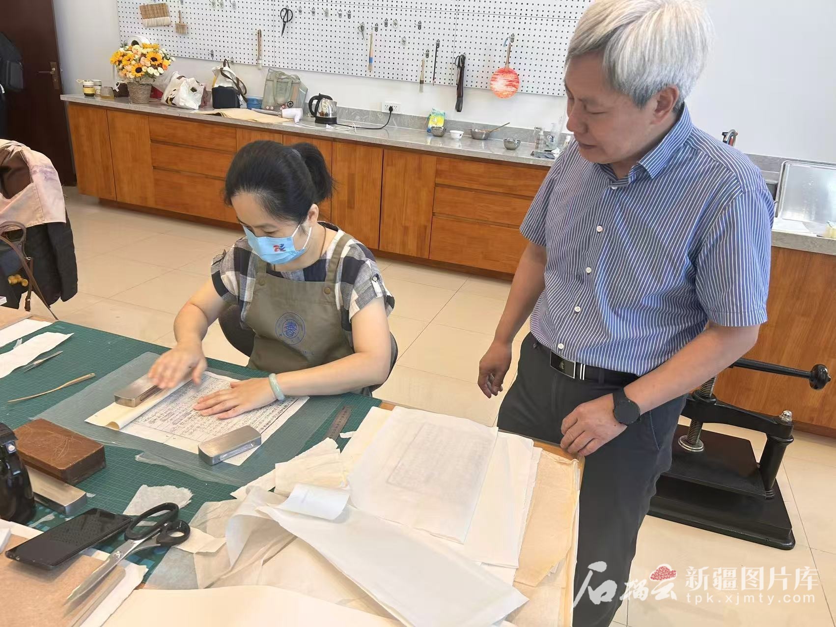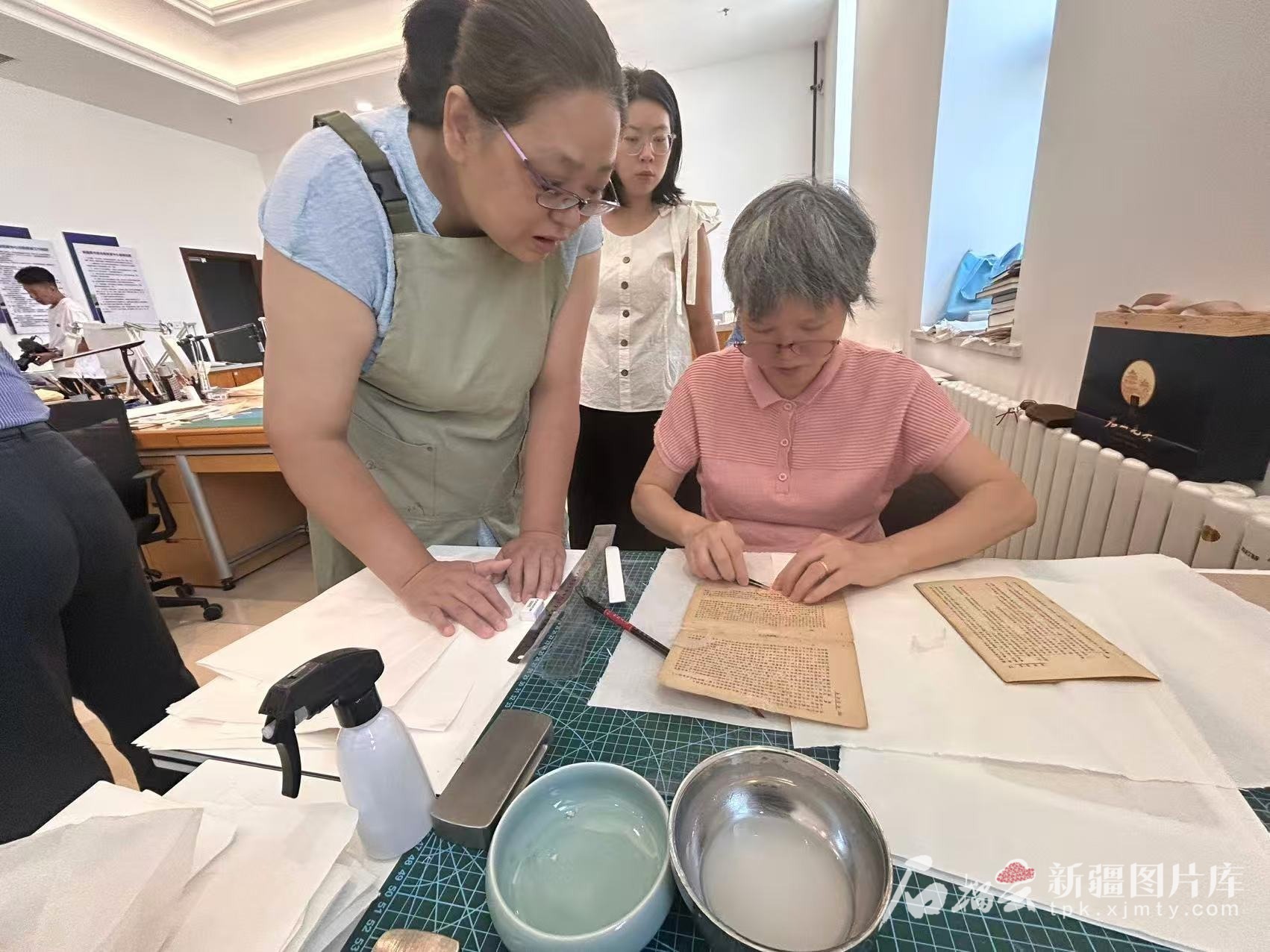 8月14日,新疆图书馆三楼的国家级古籍修复技艺传习中心——新疆传习所,古籍修复师们正在实际操作修复工作。石榴云/新疆日报记者 阿比拜摄