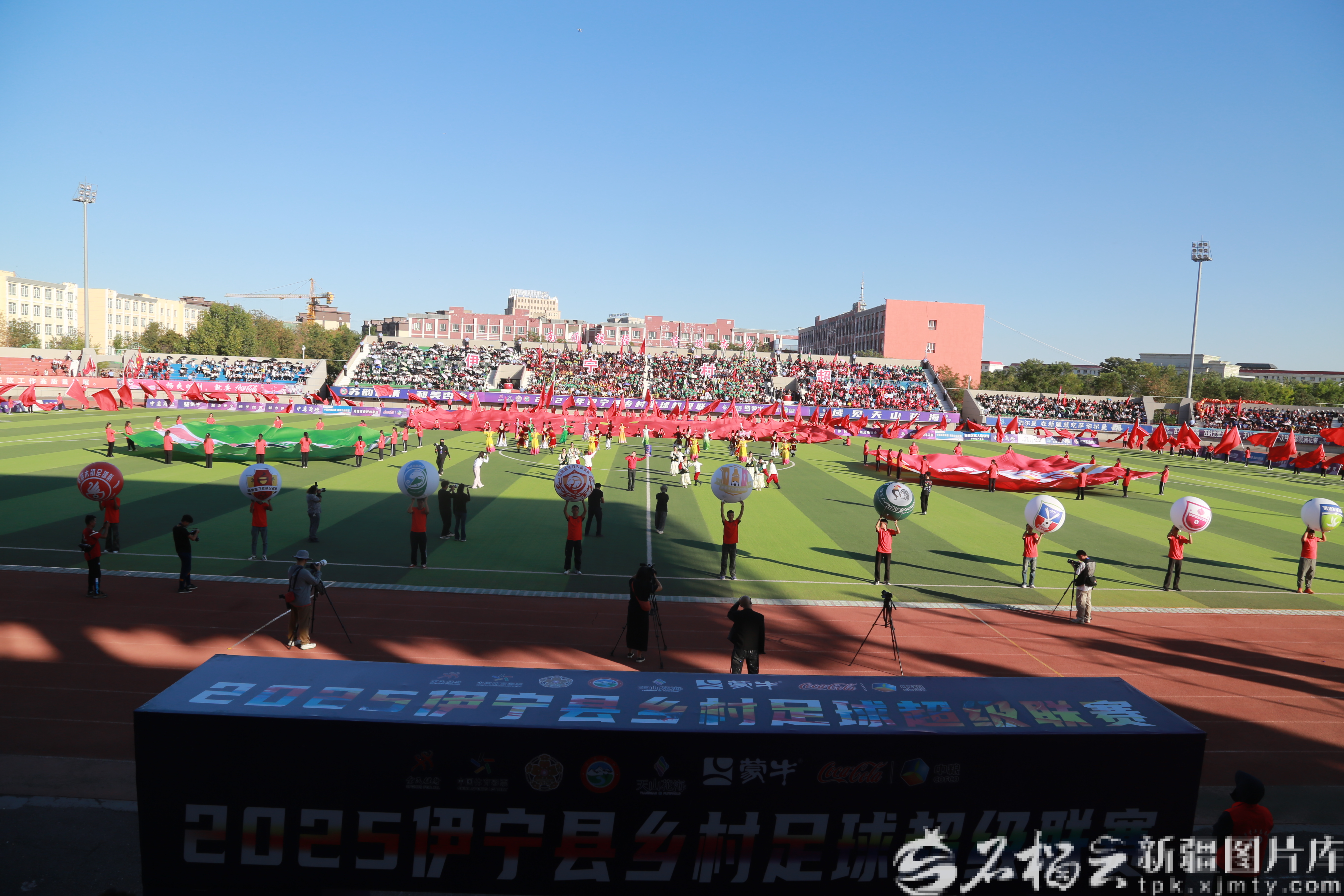 9月5日,伊宁县乡村足球超级联赛决赛开赛。图为伊宁县歌舞团演员在决赛前进行歌舞表演。