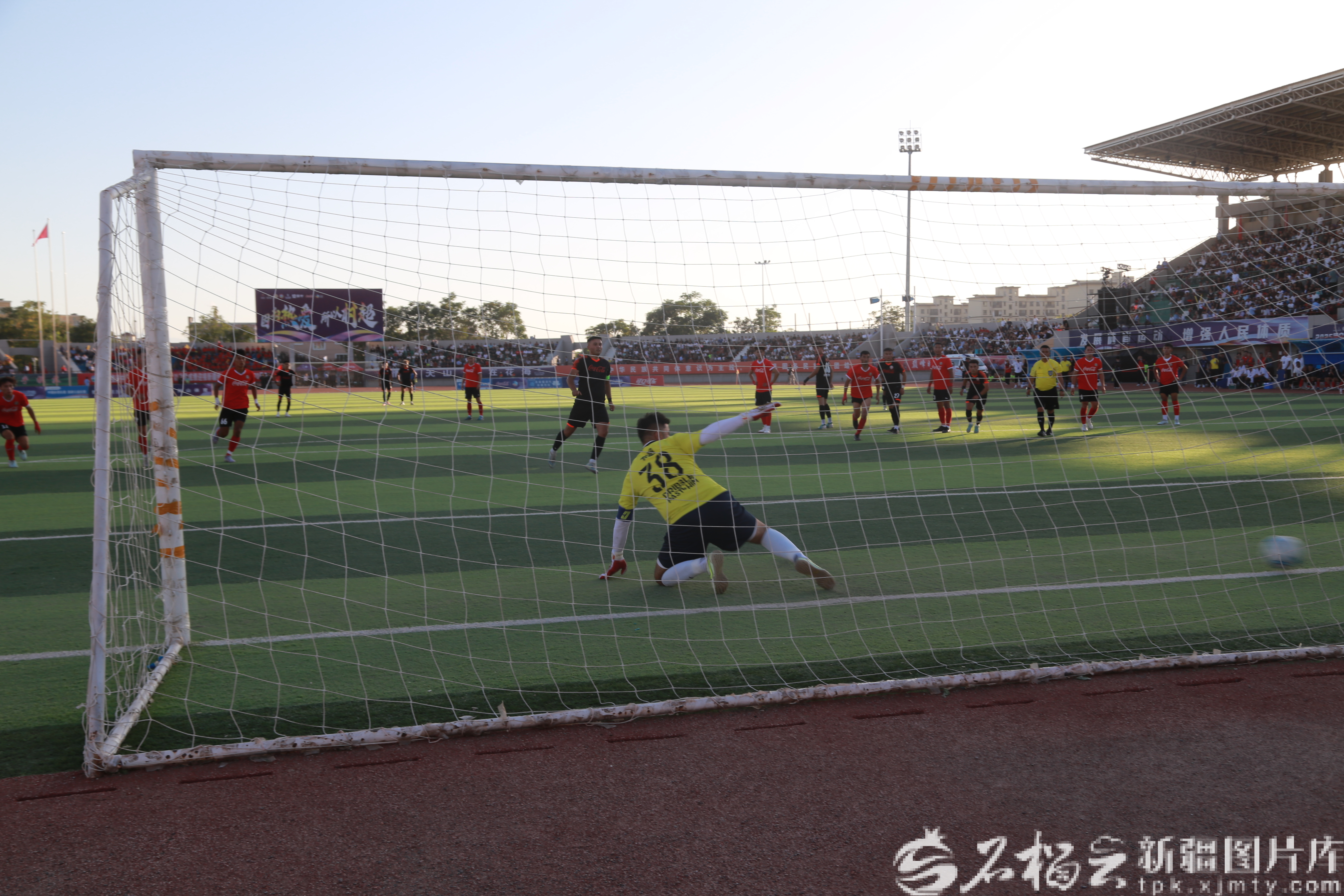 9月5日,伊宁县乡村足球超级联赛决赛上半场,吐鲁番于孜乡队球员率先破门。