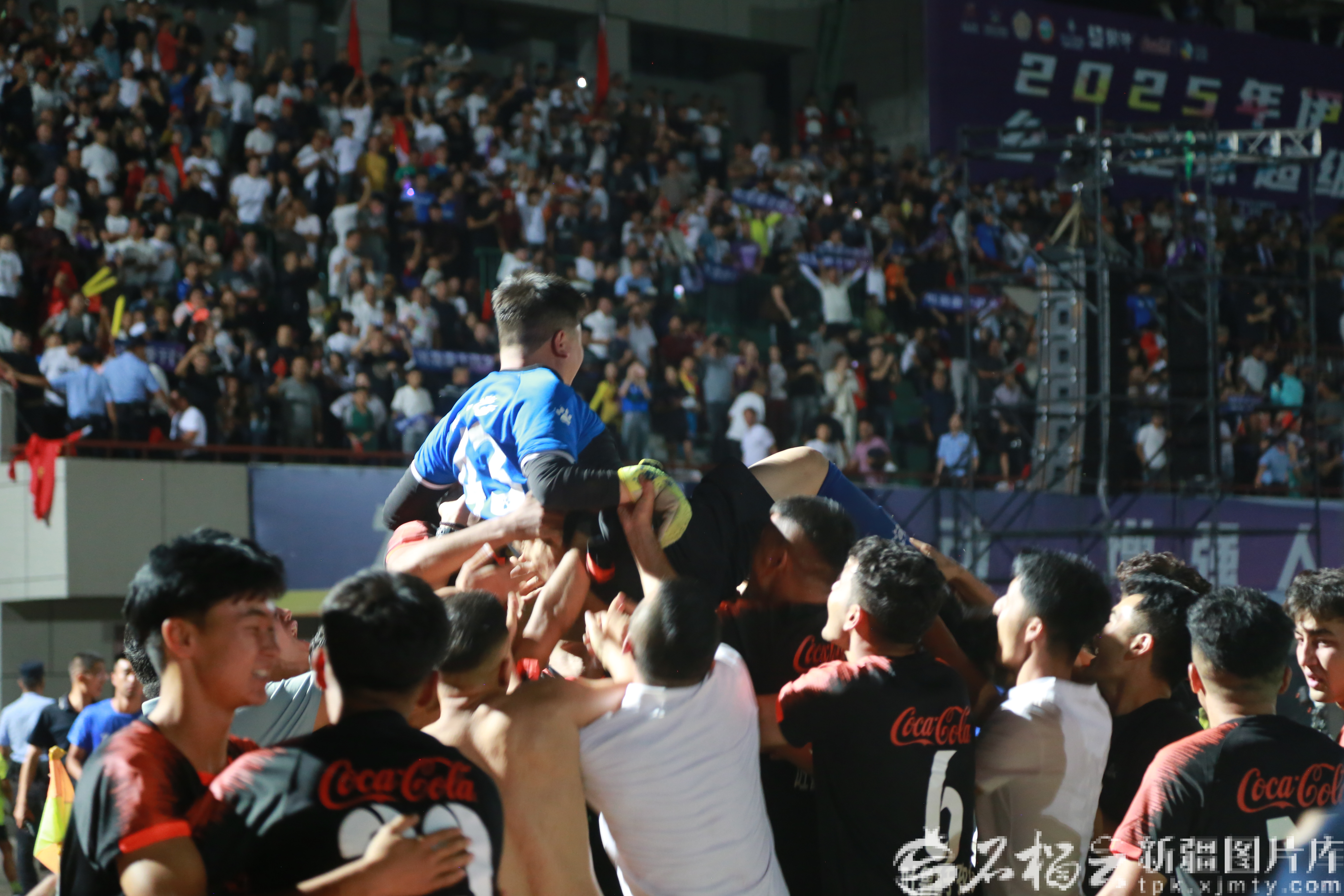 吐鲁番于孜乡队夺冠后,球员们高高抛起守门员,以示庆祝。