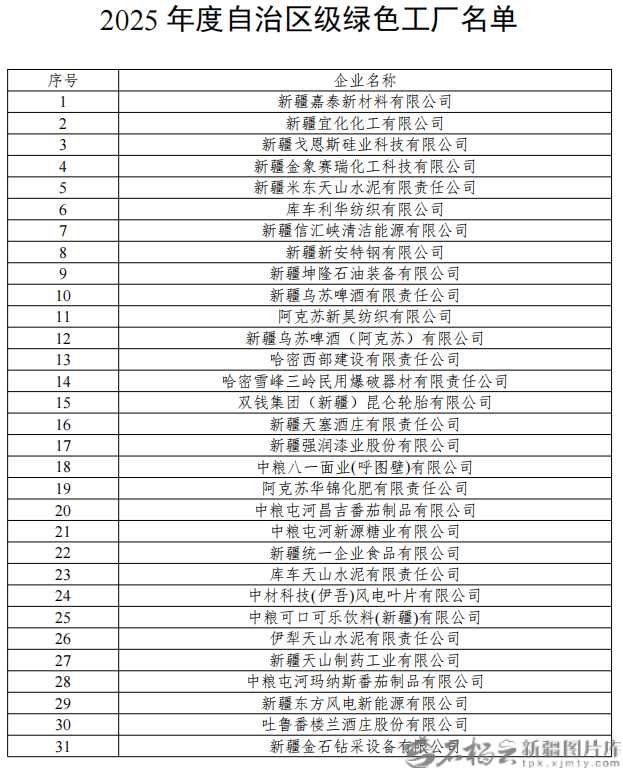 天山网-新疆日报讯(记者马伊宁报道)10月9日,记者从自治区工业和信息化厅获悉:日前,2025年度自治区级绿色制造示范单位名单公布,共有自治区级绿色工厂31家,自治区级绿色供应链管理企业1家,自治区级绿色工业园区1家。