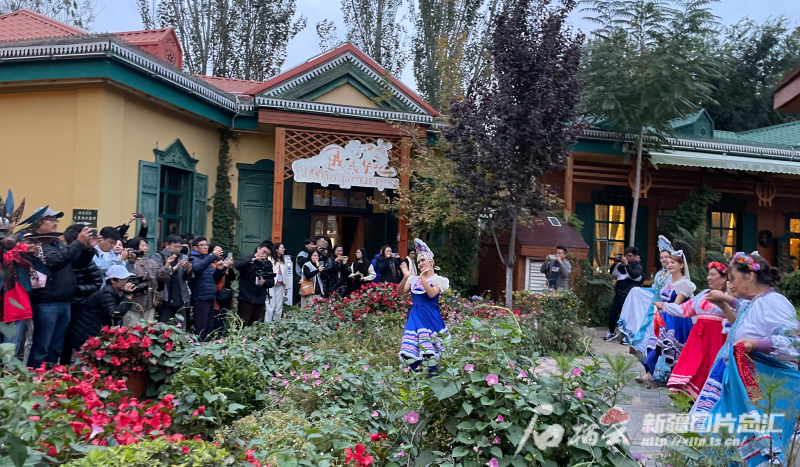 参加第六届世界媒体峰会的外媒代表,在伊宁市六星街观看歌舞表演。资料图