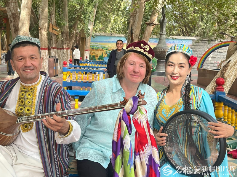 澳大利亚80岁游客麦迪娜(中)在景区与艺人们合照。祖力菲亚·艾买提摄