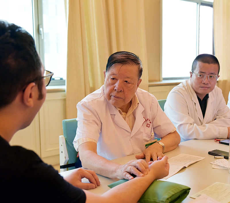 国医大师、新疆医科大学第四附属医院(自治区中医医院)首席专家沈宝藩教授(中)为患者诊脉(2023年8月24日摄)。