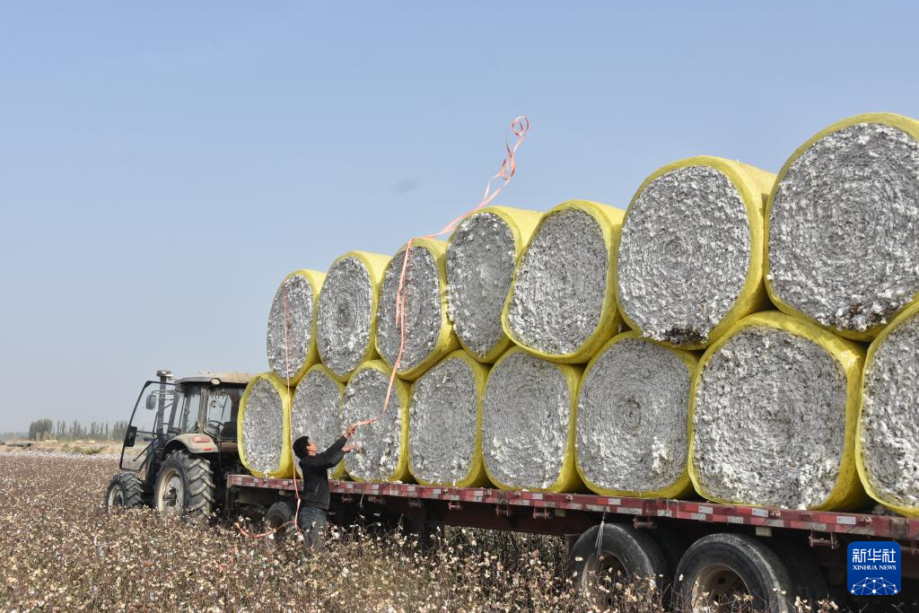 10月21日,在新疆阿克苏地区沙雅县,打包好的棉花被送往轧花厂。新华社记者 贺小童 摄