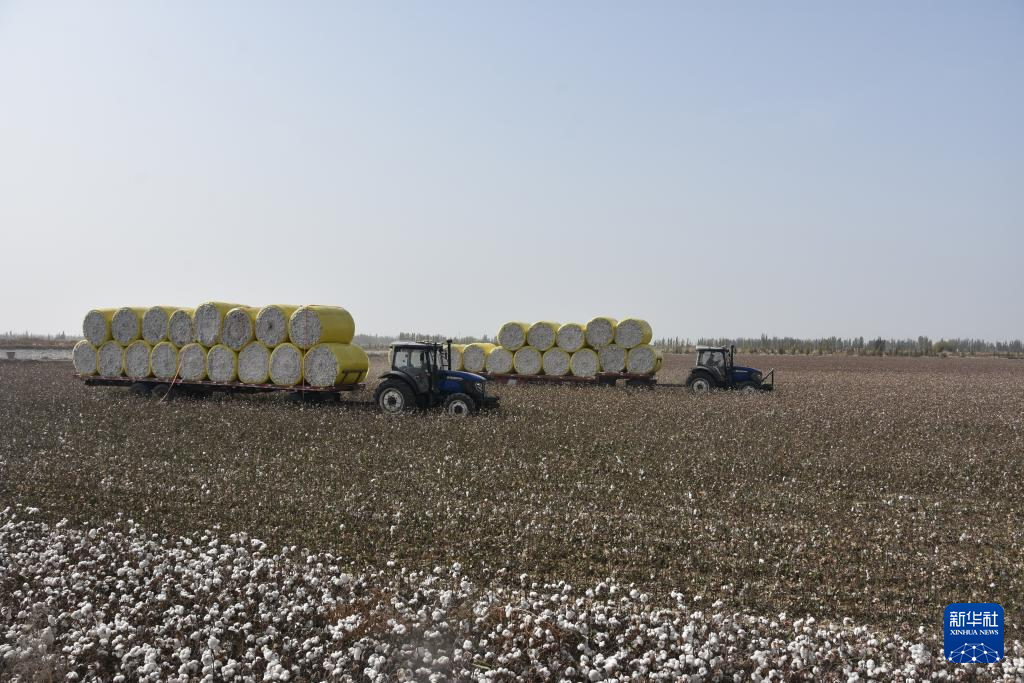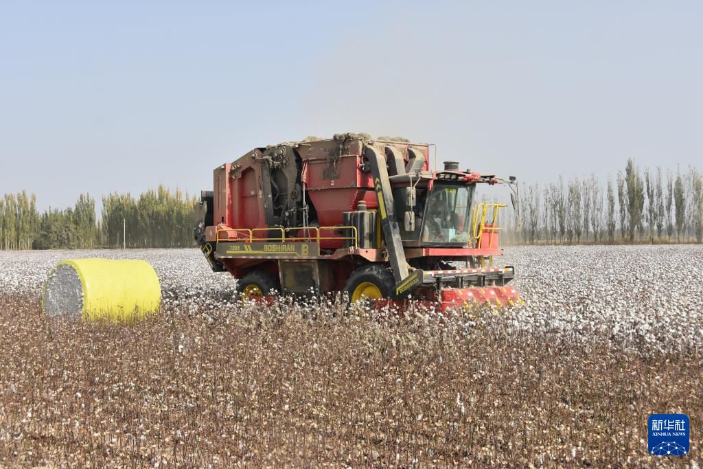 10月21日,采棉机在新疆阿克苏地区沙雅县的棉田中工作,旁边是刚采收打包好的棉花。新华社记者 贾钊 摄