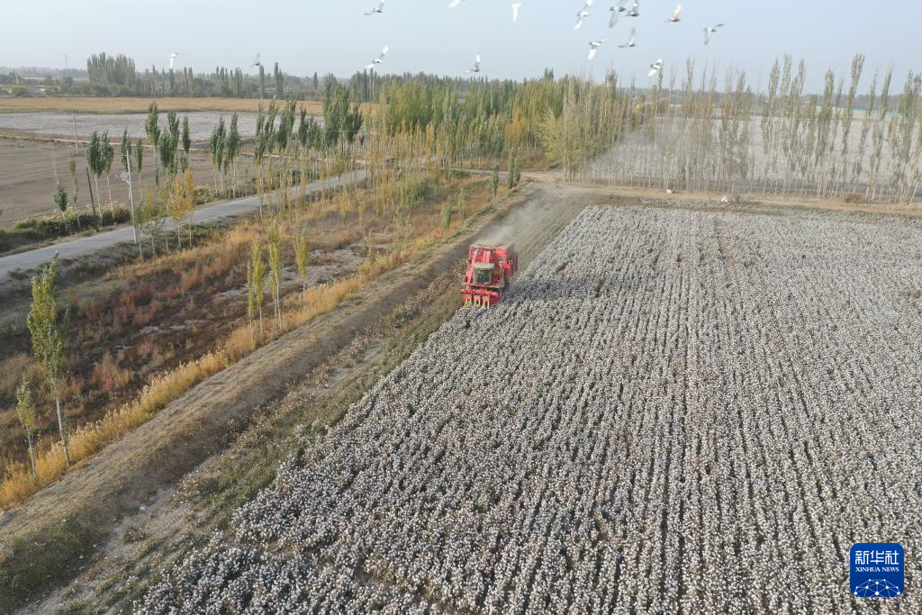 10月21日,采棉机在新疆阿克苏地区沙雅县的棉田中工作(无人机照片)。新华社记者 宿传义 摄