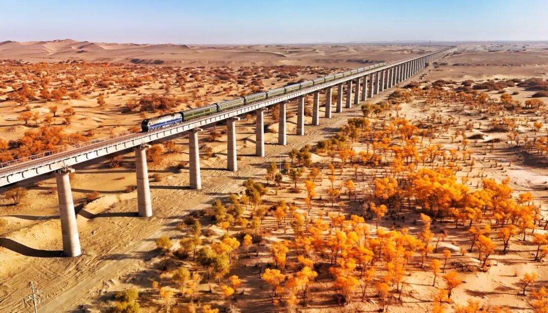 这两天,一条“新疆胡杨林换上金装”冲上微博同城热搜。视频中,一列列火车疾驰在和若铁路若克雅特大桥上,铁路两侧胡杨林与沙海绚烂而宏大,美不胜收。