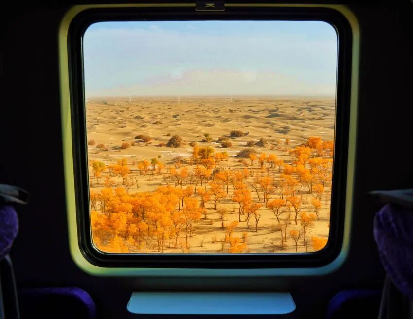 其中,和田至乌鲁木齐方向列车驶离民丰站后十余分钟,两侧车窗外会陆续出现大片胡杨林,持续时间约一个半小时;乌鲁木齐至和田方向列车驶离南屯站后十余分钟,旅客可以欣赏约一个半小时的胡杨林美景。
