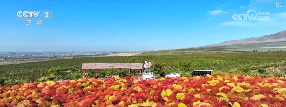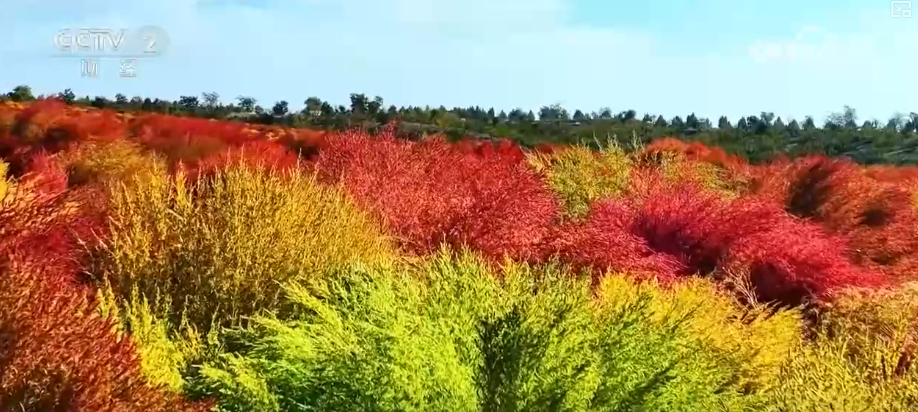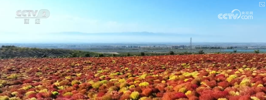 据了解,随着伊宁县的气温逐渐下降,地肤草叶片中的叶绿素会逐步分解,显现大量花青素,使植株整体色彩由绿转红,形态浑圆饱满,簇拥成片。