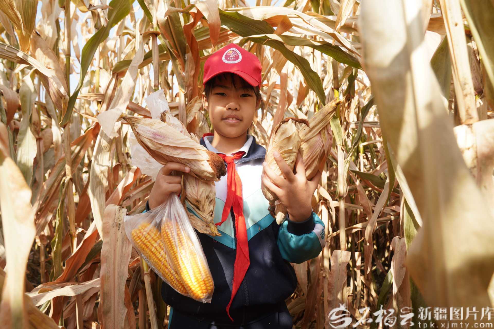 10月21日,在新疆玉维鲜农业科技中心的玉米地里,一位学生展示自己采摘的玉米棒。
