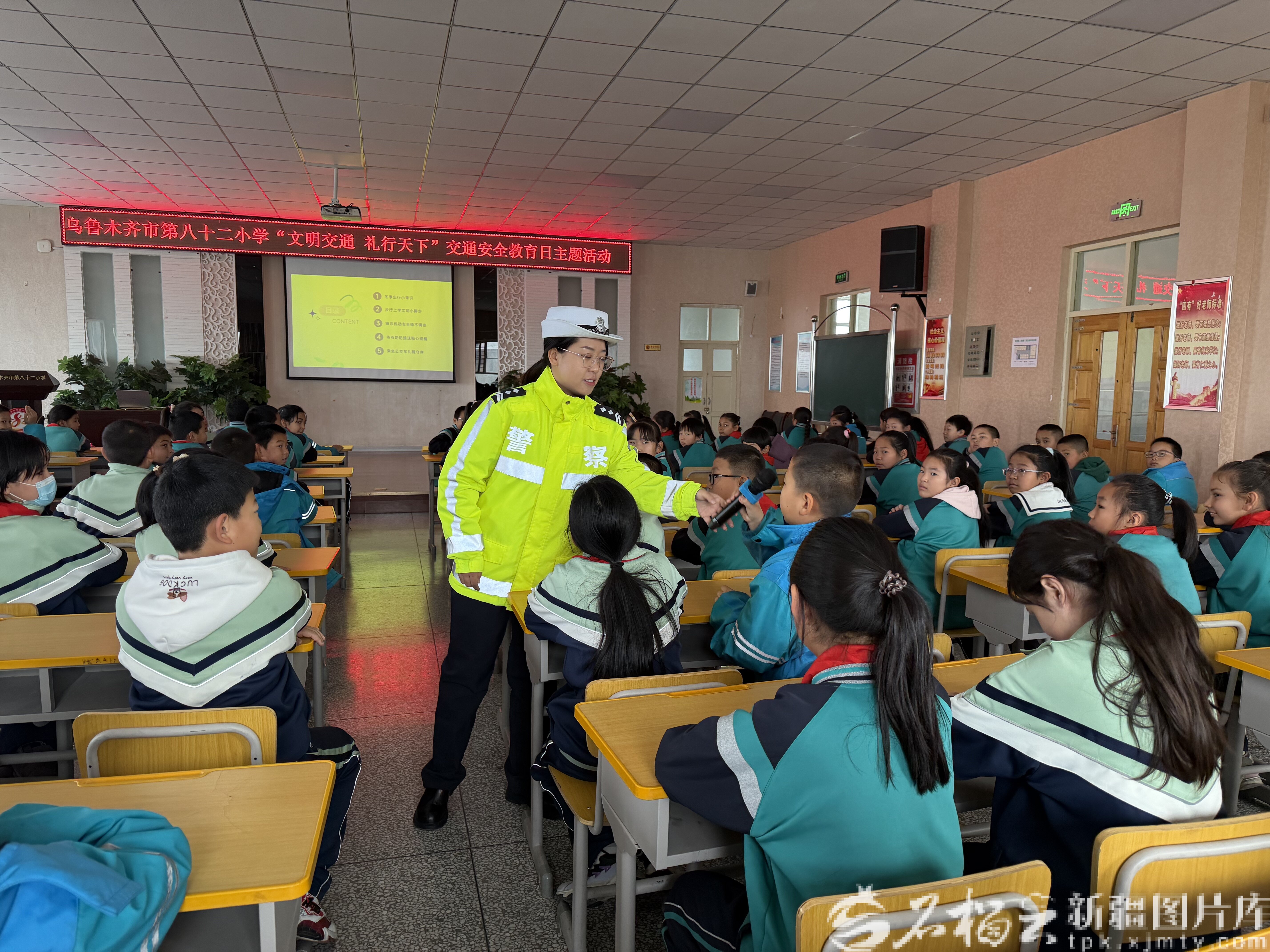 交通安全关乎学生健康成长。11月28日,乌鲁木齐市公安局交管支队高新区(新市区)大队地窝堡中队民警陈莉莉走进乌鲁木齐市第八十二小学,通过互动问答、典型事故案例分析和视频短片,直观展示了闯红灯、在马路上嬉戏打闹等行为的严重后果,引导学生认识交通安全的重要性。她用通俗易懂的语言讲解斑马线安全行走、公交车乘坐规范等交通安全常识,鼓励学生将交通安全意识融入日常,让文明礼让成为自觉习惯。