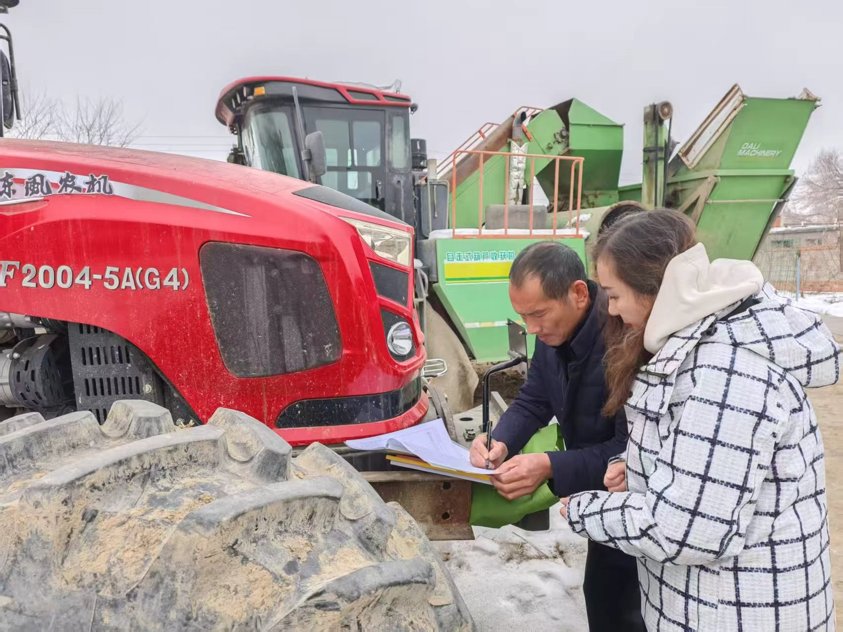 工作人员在农机户家核对农机购置补贴资金到账情况。