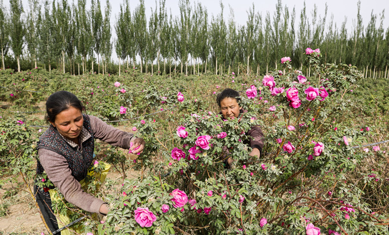 花农在于田县奥依托格拉克乡的瑰觅特色玫瑰种植基地采摘玫瑰花。许晓龙 摄