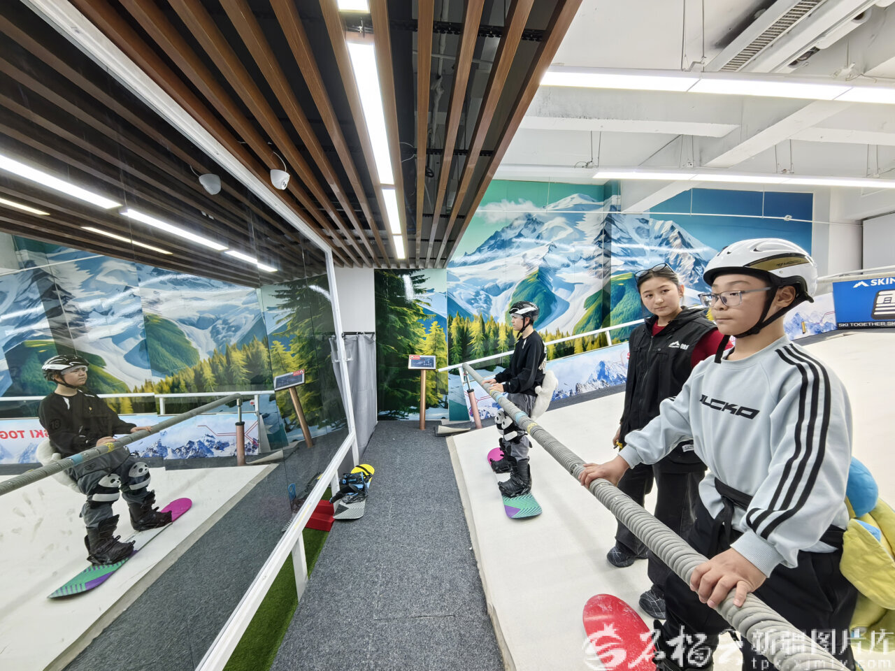 12月2日,在乌鲁木齐阳光100雪乐山室内滑雪场的模拟机上,教练在指导学员调整滑雪姿势。天山网-新疆日报记者李雄心摄