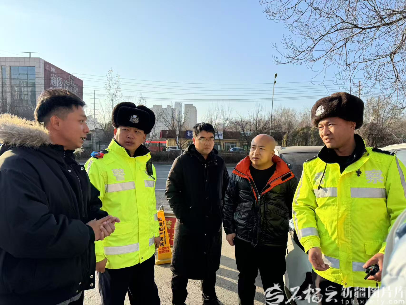 12月4日,乌鲁木齐高新技术产业开发区(新市区)喀什东路街道新兴社区主任马轩(左一),联合交警、城管部门工作人员现场协调“让车位于行”。 郭荣 摄