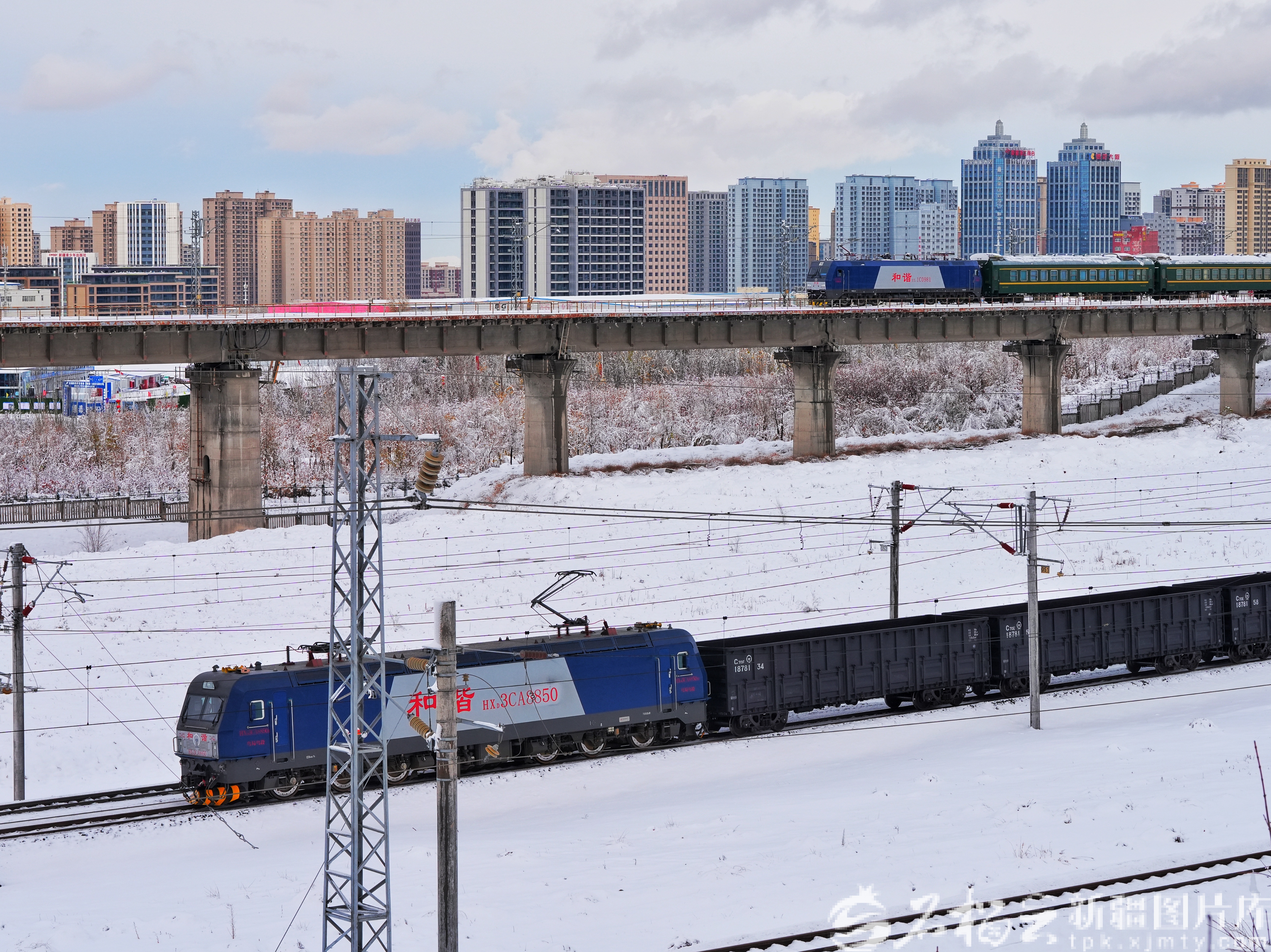 12月8日,一列煤炭专列缓缓驶出乌鲁木齐站。摆风亮 摄