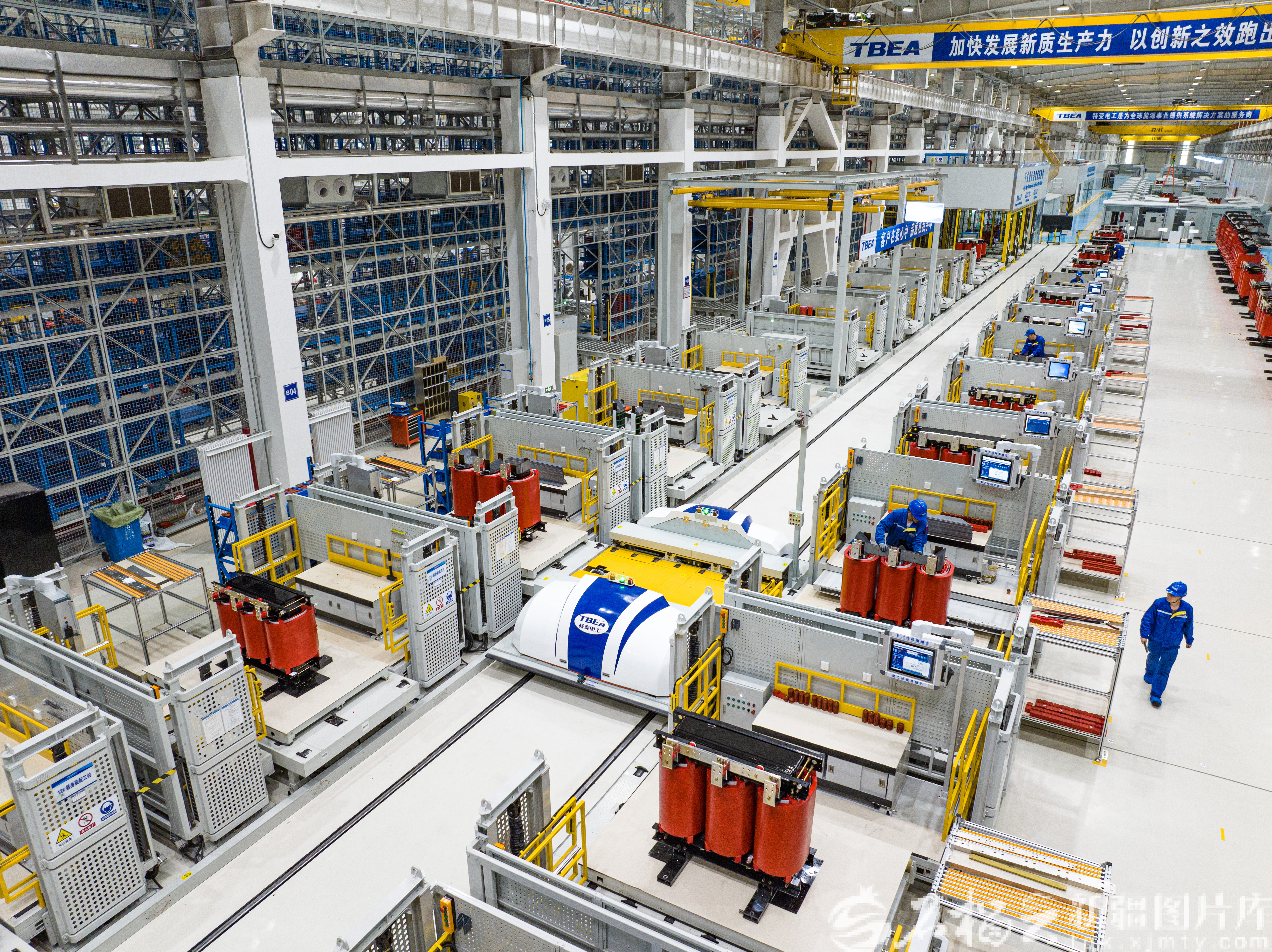 4月6日,昌吉市特变电工智能电气有限责任公司数字化干式变压器生产车间,工作人员在生产线上作业。何龙摄