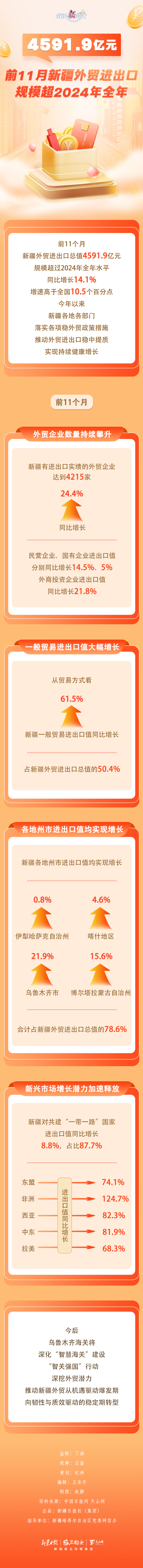 2025年前11个月,新疆外贸进出口总值达4591.9亿元,规模超过2024年全年水平。新疆各类企业进出口值增长情况如何?各地州市外贸进出口表现怎样?今天的《数说“新”变化》一起来看看。