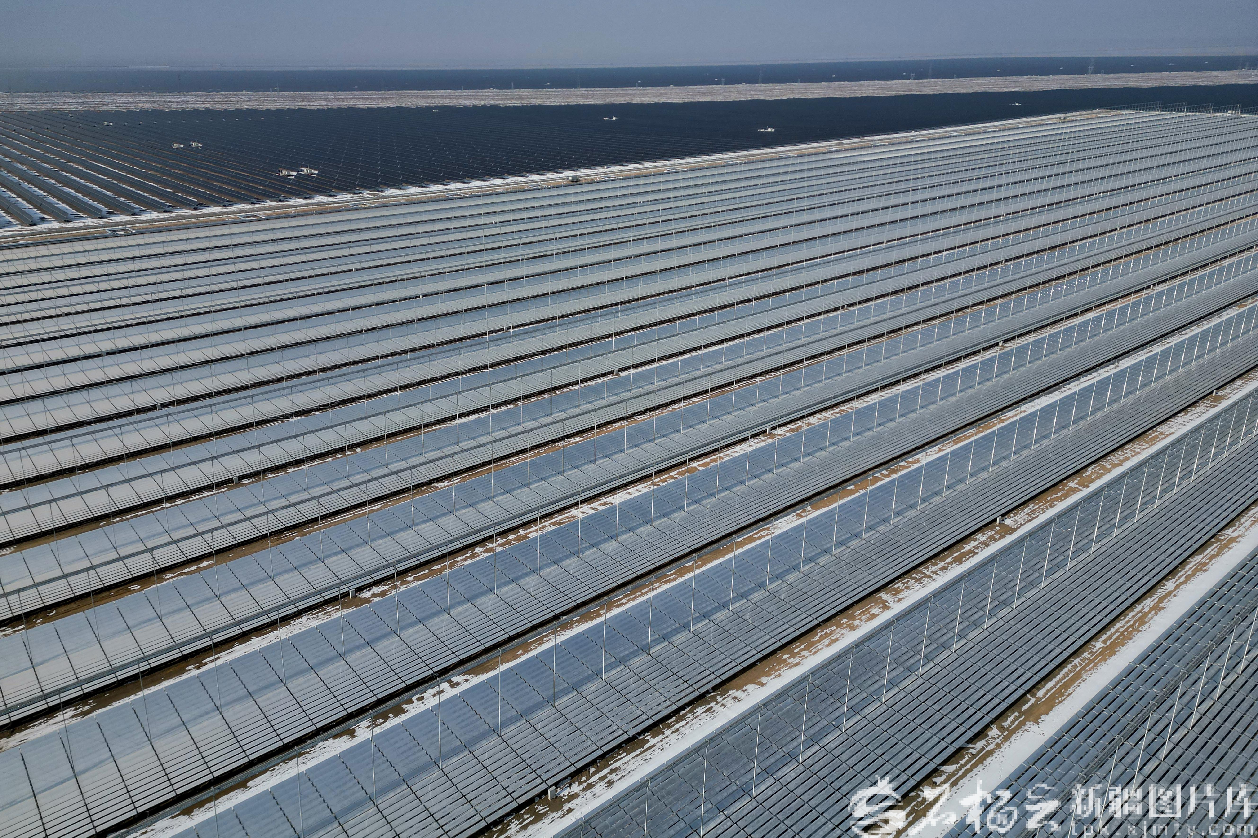1月12日,在哈密市伊州区北部拍摄的大唐石城子100万千瓦“光热+光伏”一体化清洁能源示范项目一角(无人机摄)。