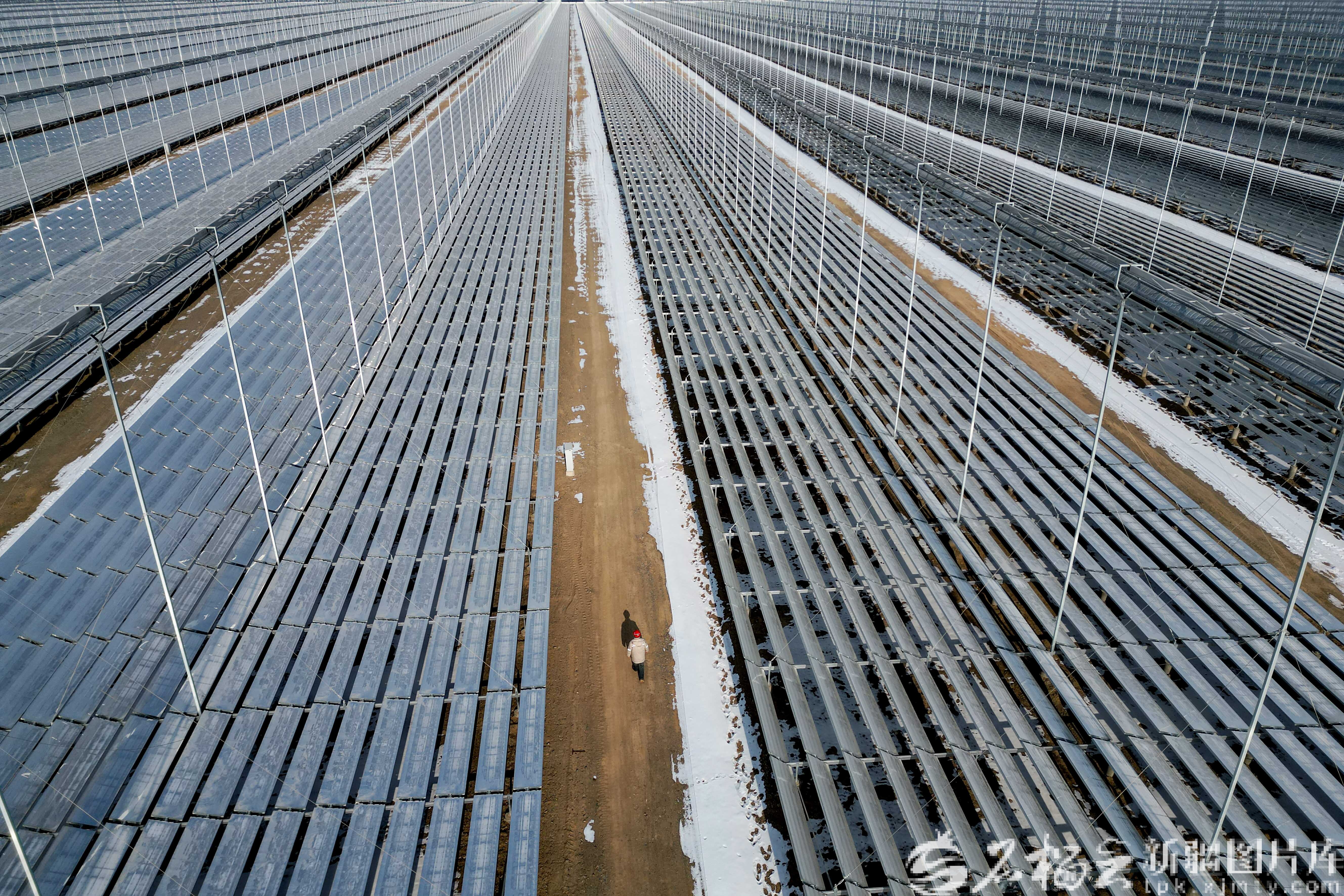 1月12日,工作人员在位于哈密市伊州区北部的大唐石城子100万千瓦“光热+光伏”一体化清洁能源电站巡查(无人机摄)。