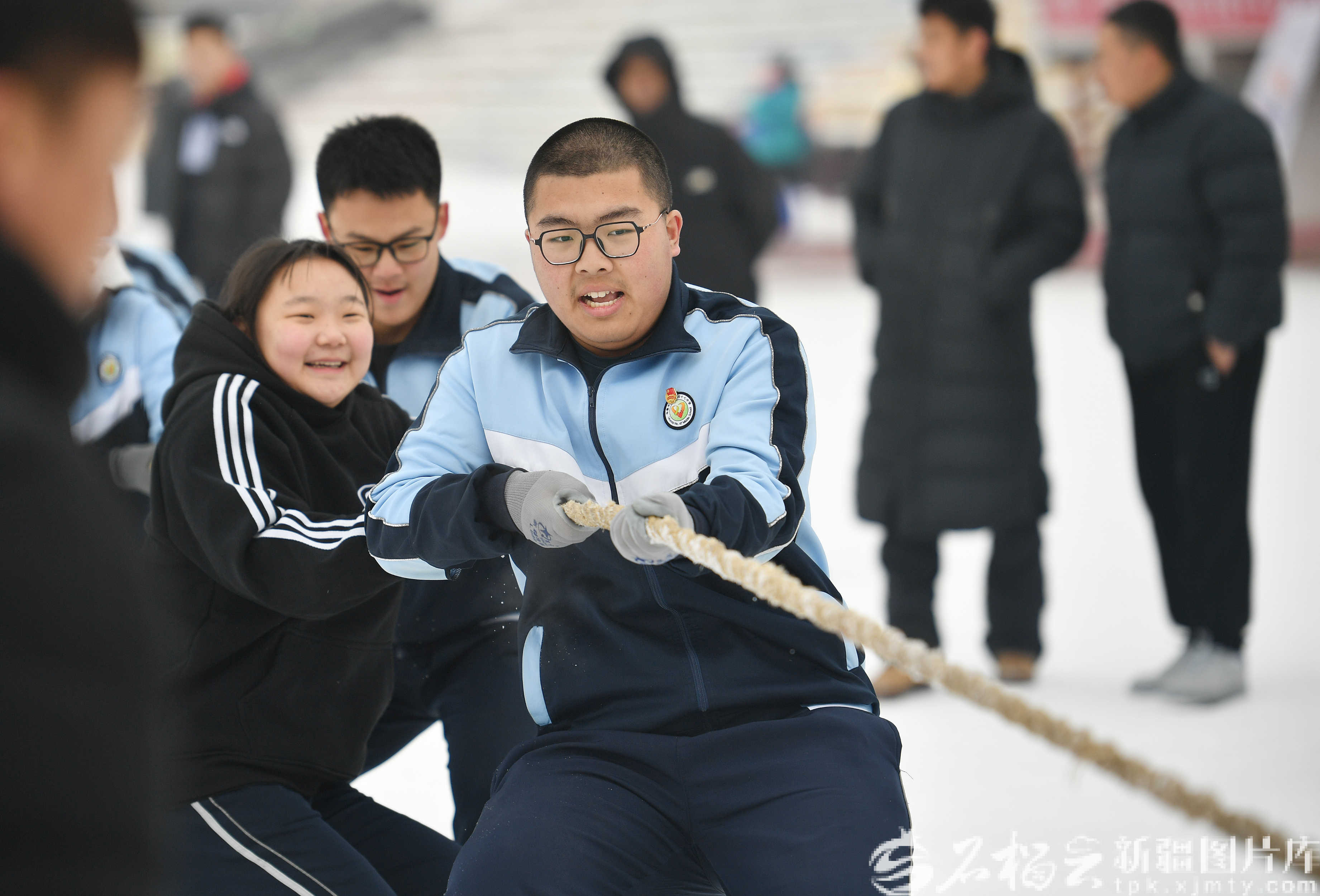 1月14日,在雪地拔河比赛中,乌鲁木齐市第47中学参赛选手奋力拉拽。