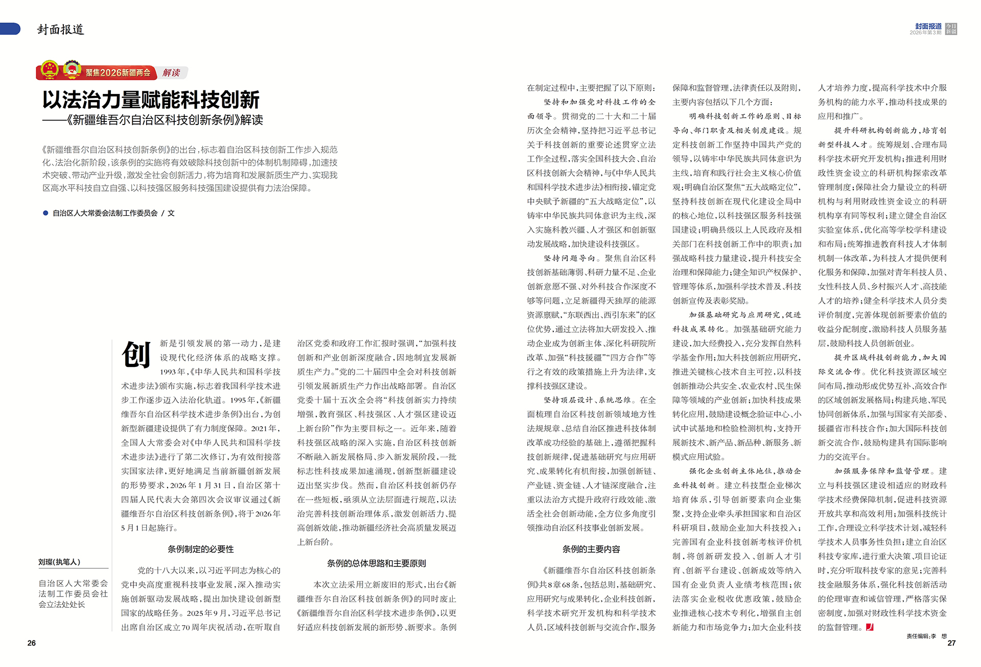 《新疆维吾尔自治区科技创新条例》的出台,标志着自治区科技创新工作步入规范化、法治化新阶段,该条例的实施将有效破除科技创新中的体制机制障碍,加速技术突破、带动产业升级,激发全社会创新活力,将为培育和发展新质生产力、实现我区高水平科技自立自强、以科技强区服务科技强国建设提供有力法治保障。