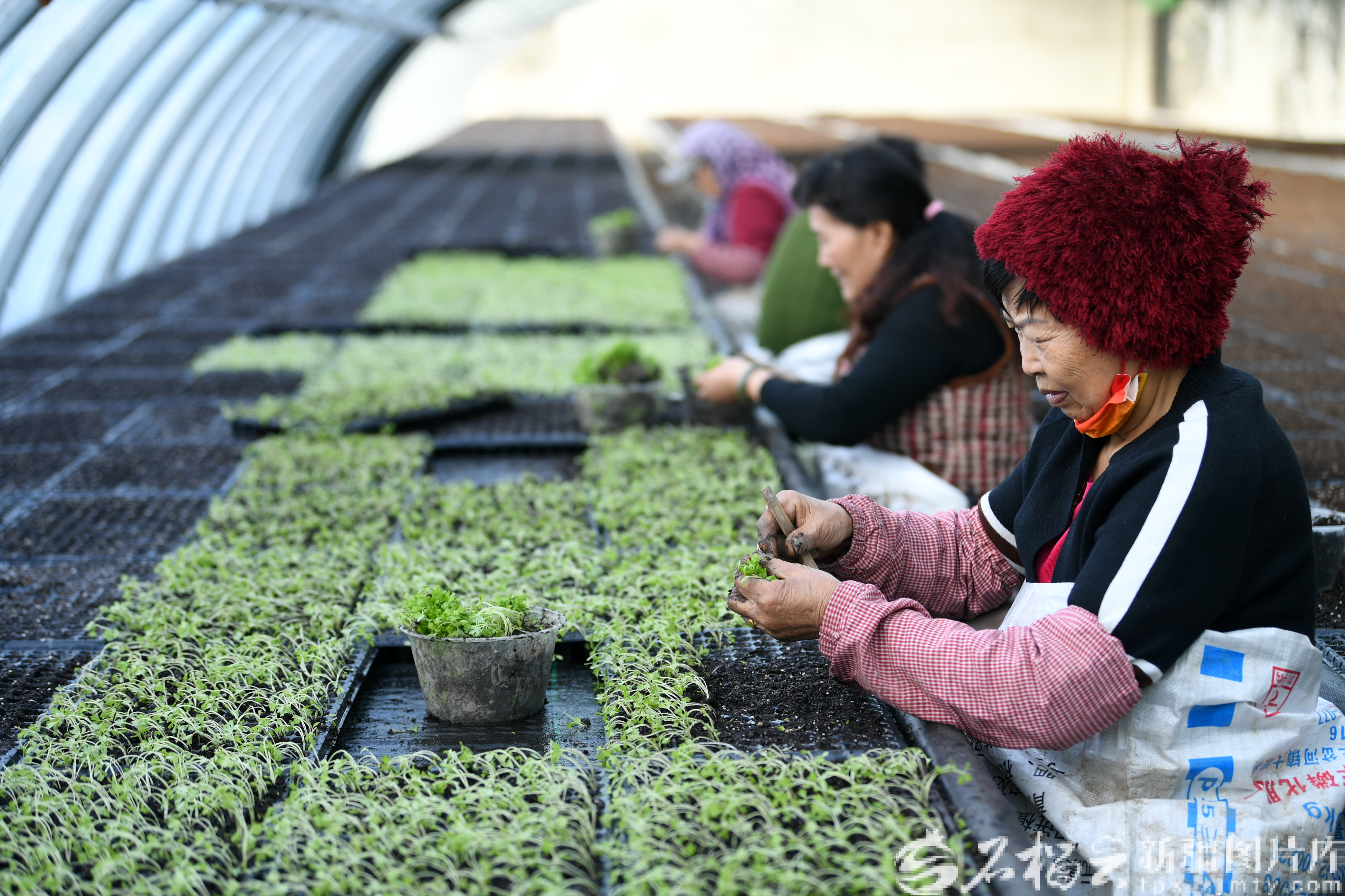 2月12日,在乌鲁木齐高新区(新市区)青格达湖乡新联村的清洁能源智能温室里,村民们在播种芹菜。