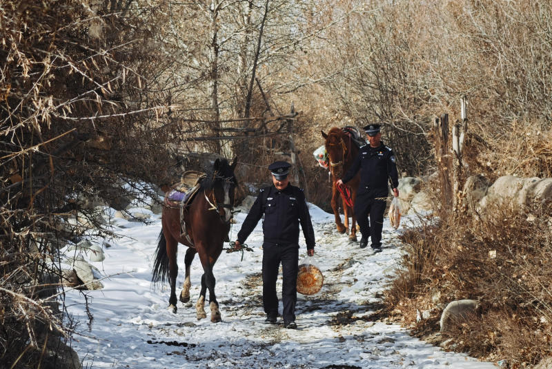 该牧区海拔3200余米,山高路远、牧道狭窄,冬季积雪覆盖致车辆难行,马匹成为警务服务直达牧民家的唯一交通工具。