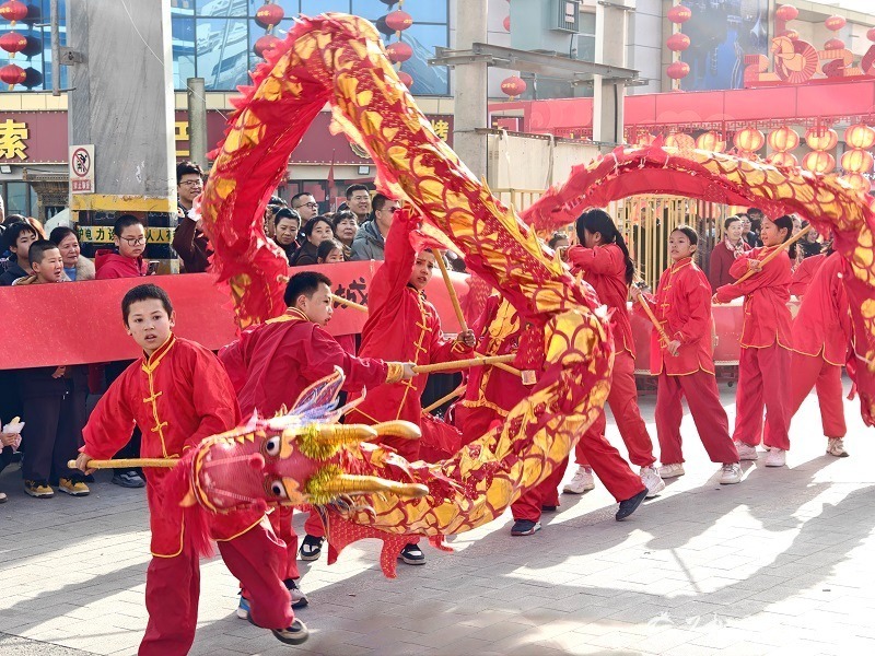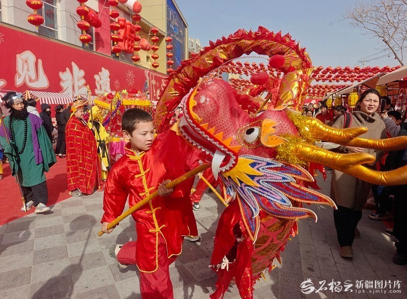2月19日,库尔勒市第十小学的小朋友在梨城美食街表演舞龙,赢得市民、游客阵阵喝彩。连日来,该市2026年“金马贺春·韵满巴州”春节庙会系列活动火热开展,浓浓年味溢满梨城。 栗卫平摄