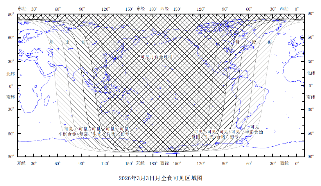 3月3日月全食可见区域图。图/中国科学院紫金山天文台网站