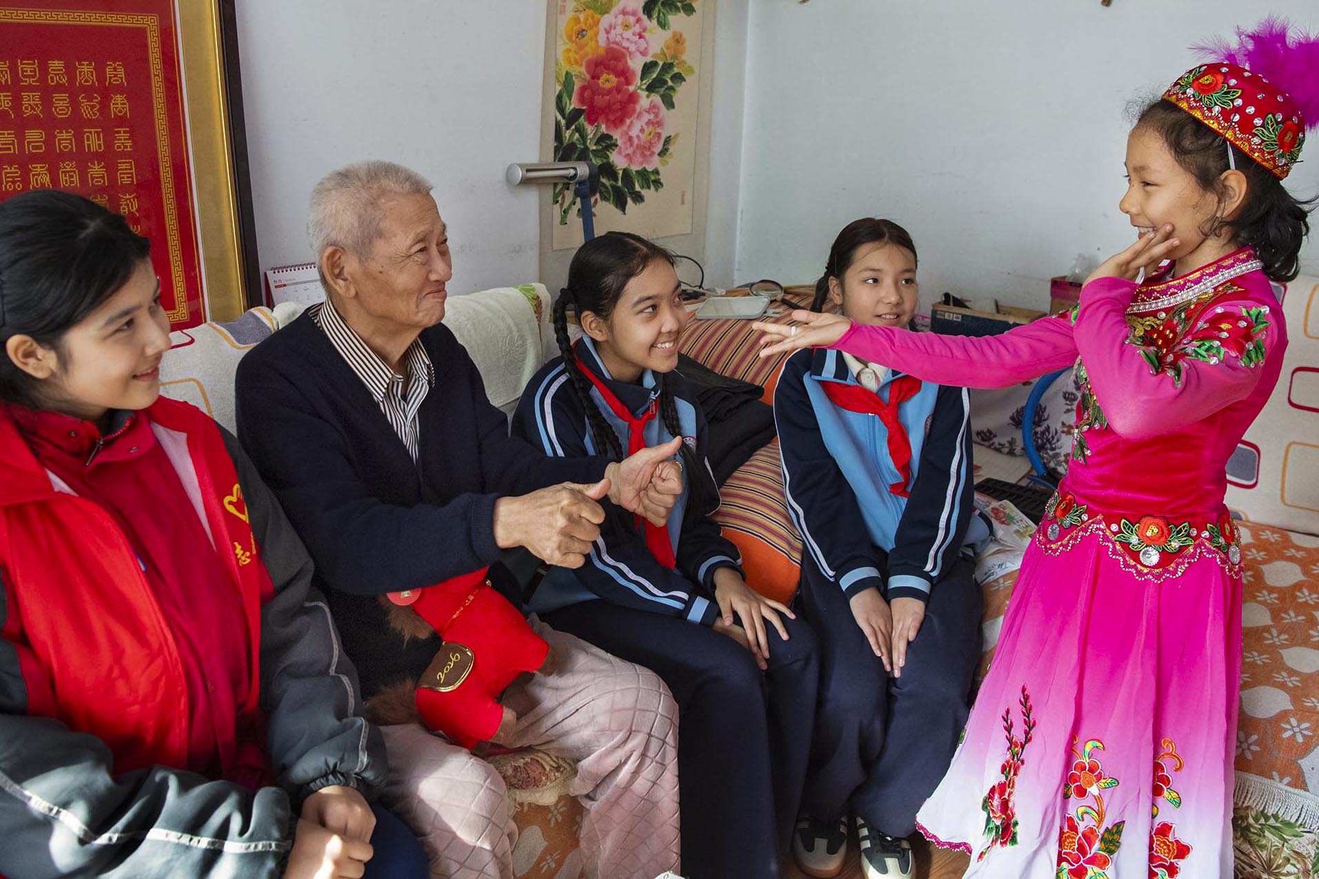 3月4日,在乌鲁木齐市天山区南湾街街道延安路社区86岁的独居老人张茂松家中,学生在为老人表演才艺。当日,乌鲁木齐市天山区多地开展学雷锋系列活动,以实际行动传承雷锋精神。记者 约提克尔·尼加提摄