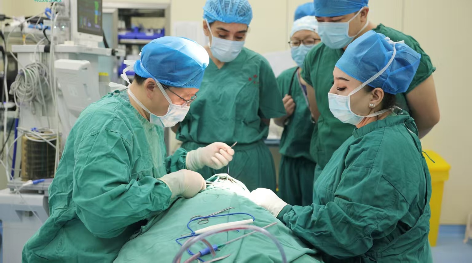 3月7日,上海交通大学医学院附属第九人民医院医生陈阳(左一)在喀什地区第二人民医院为唇腭裂患儿进行手术,也为该院颌面外科的医护团队提供了宝贵的学习机会。喀什地区第二人民医院供图
