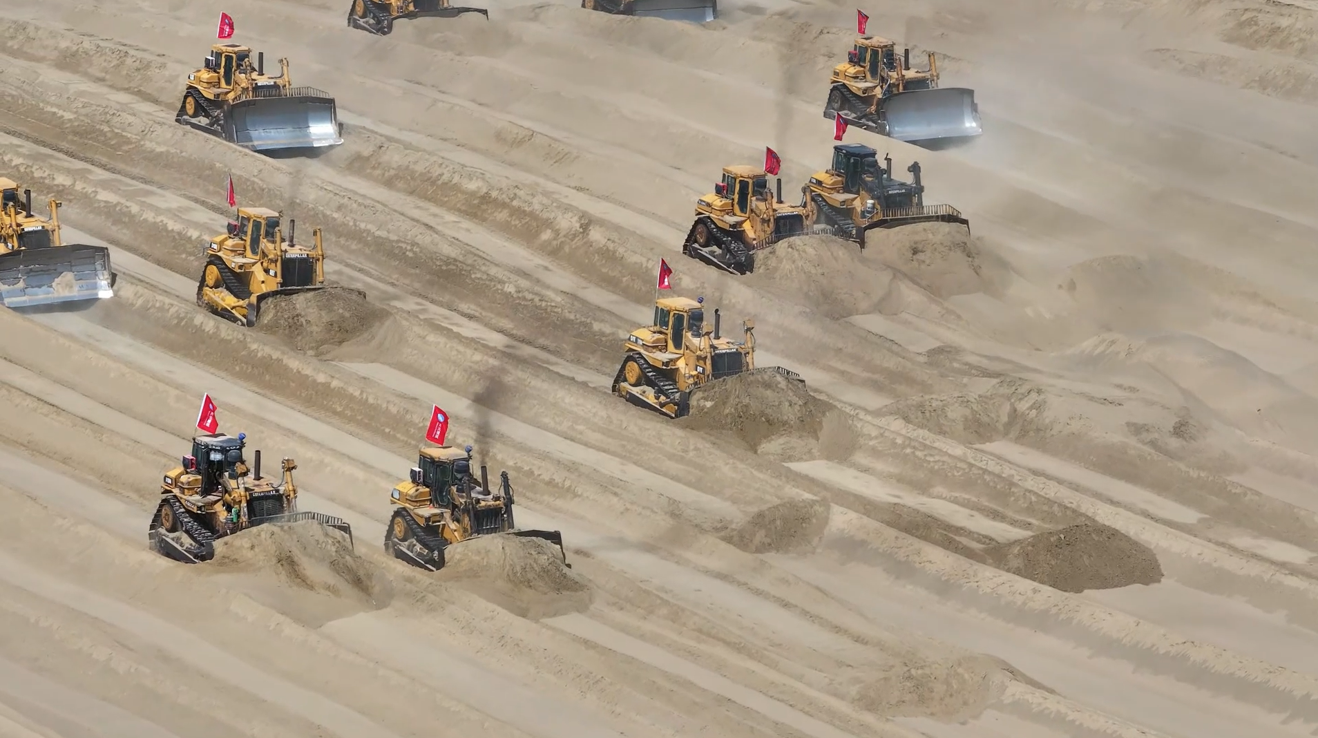 图为2025年3月拍摄的新疆生产建设兵团第十四师昆玉市7.38万亩沙漠工程治理区施工现场,推土机正在作业。