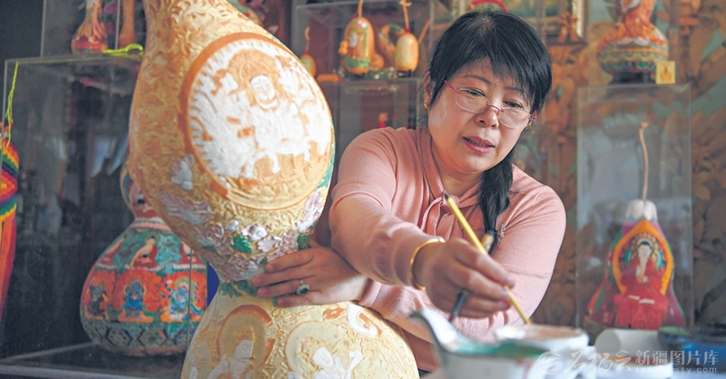 3月30日,马江红为雕刻完成的葫芦上色。