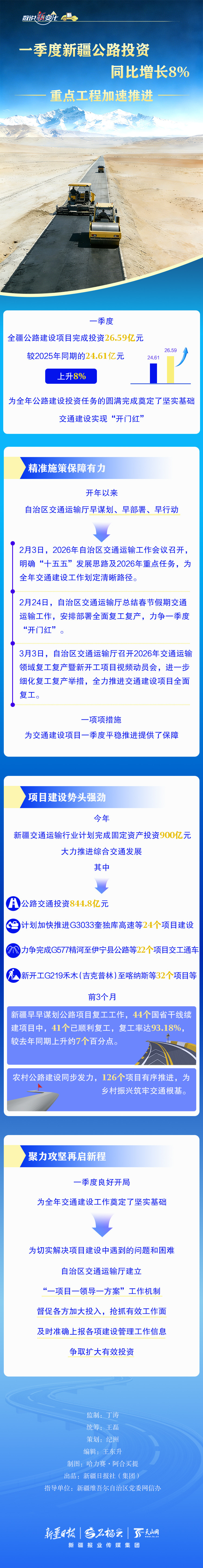 一季度,全疆公路建设项目完成投资26.59亿元,较2025年同期的24.61亿元上升8%,交通建设实现“开门红”。亮眼数据的背后,新疆交通运输部门做了哪些努力?本期《数说“新”变化》,一同来看看。