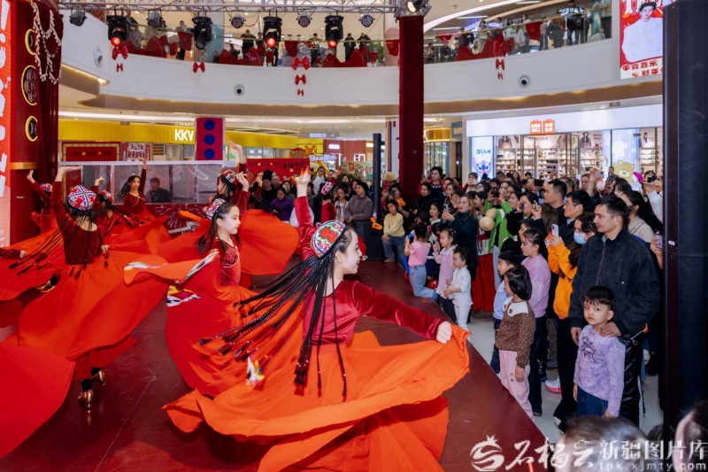 2月20日,在乌鲁木齐天山万科广场中庭,特色节目表演吸引消费者驻足观看。(资料图)