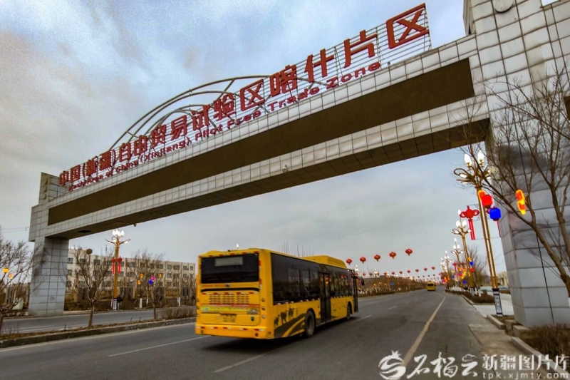 2月6日,一辆巴士从中国(新疆)自由贸易试验区喀什片区欧亚大道上驶过。(资料图)