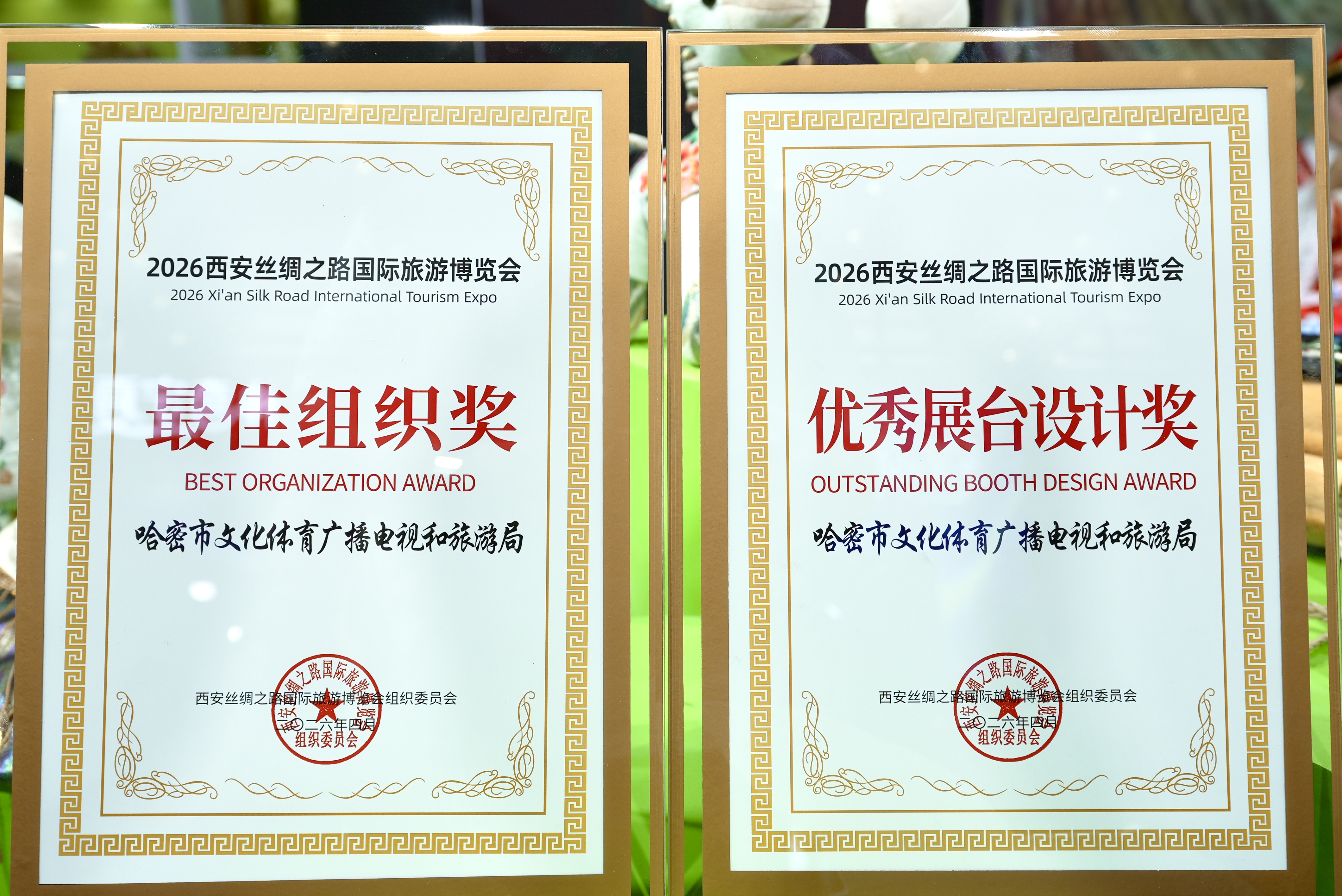 哈密文旅在2026丝绸之路国际旅游博览会上获得“优秀展台设计奖”与“最佳组织奖”。何逸昂摄