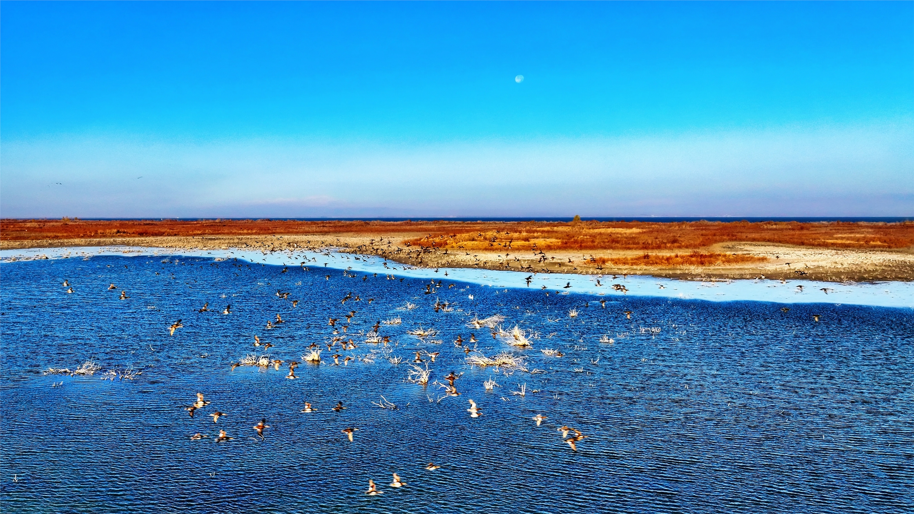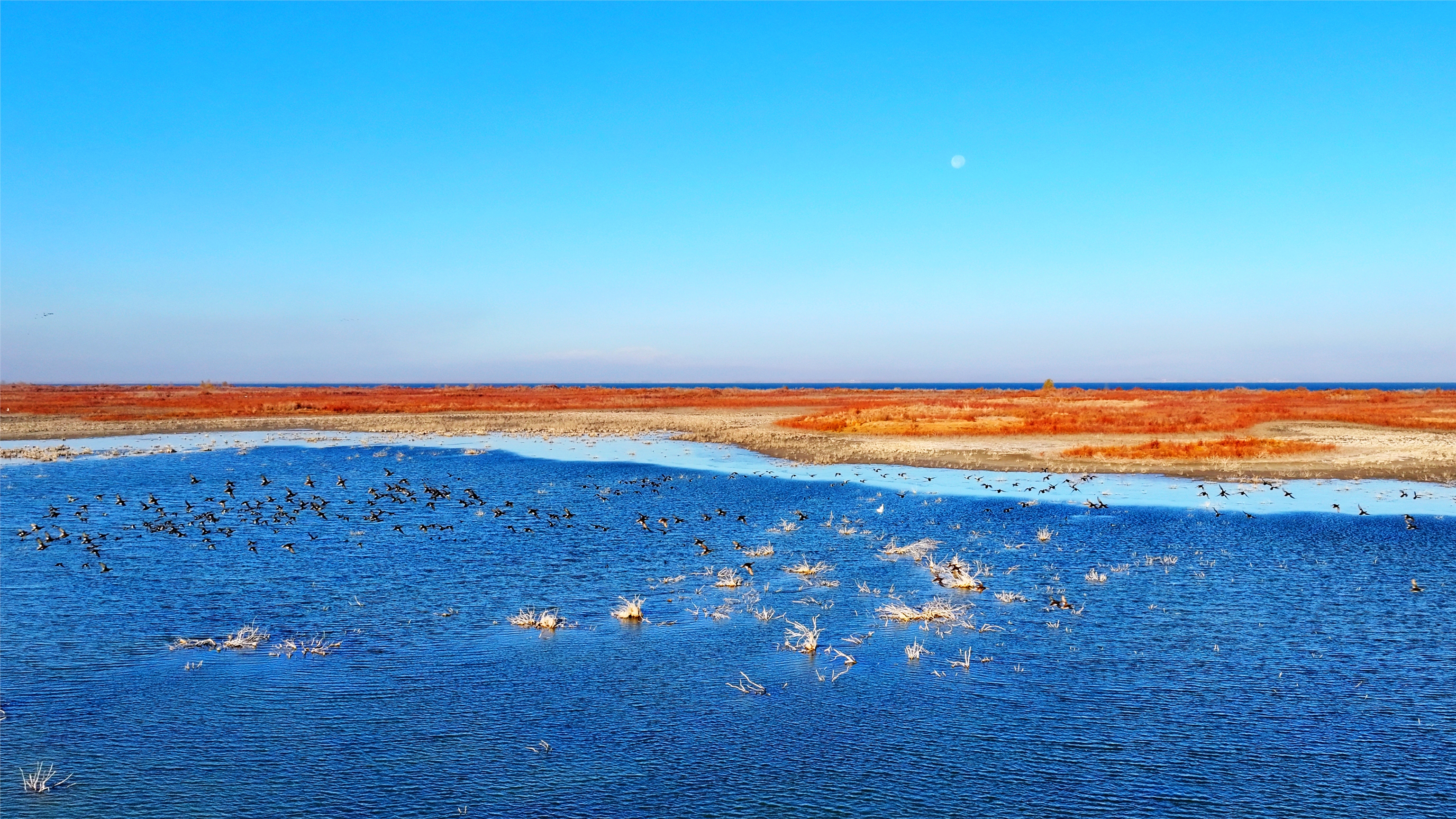 11月9日,博斯腾湖静谧如画,天鹅、皓月与雪山相映,尽展博湖冬日灵秀。通讯员谭辉摄