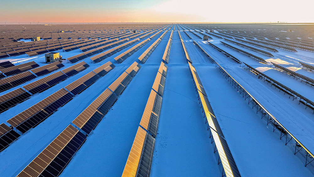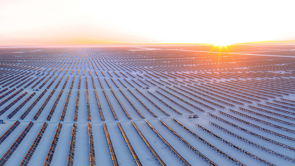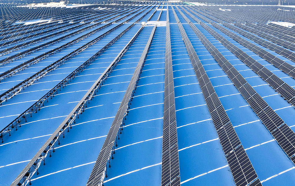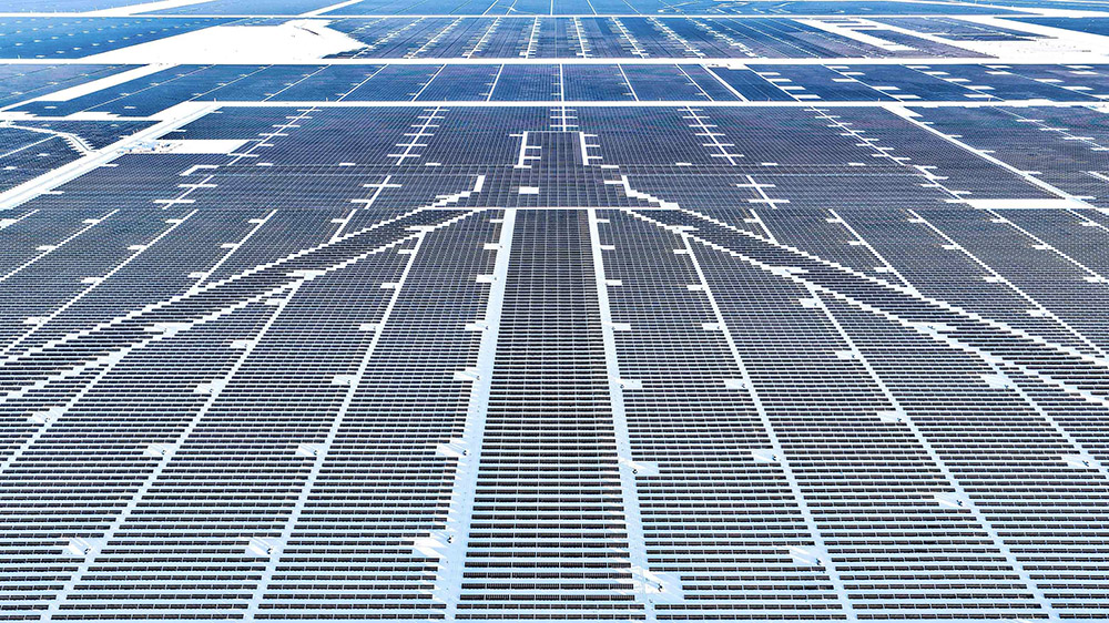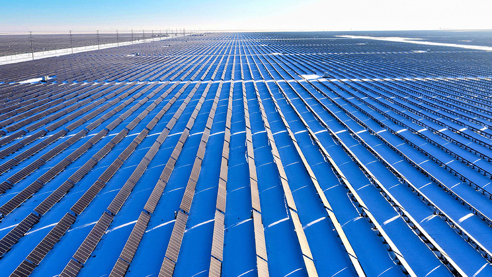 1月24日,新疆昌吉回族自治州木垒哈萨克自治县,光伏产业园犹如茫茫雪原上的蔚蓝大海,冰雪铺展如素笺、光伏板列阵似铠甲,阳光倾洒,板面熠熠生辉。光电在无声中转换,电流在寂静中奔涌,为这片荒原注入无限生机。