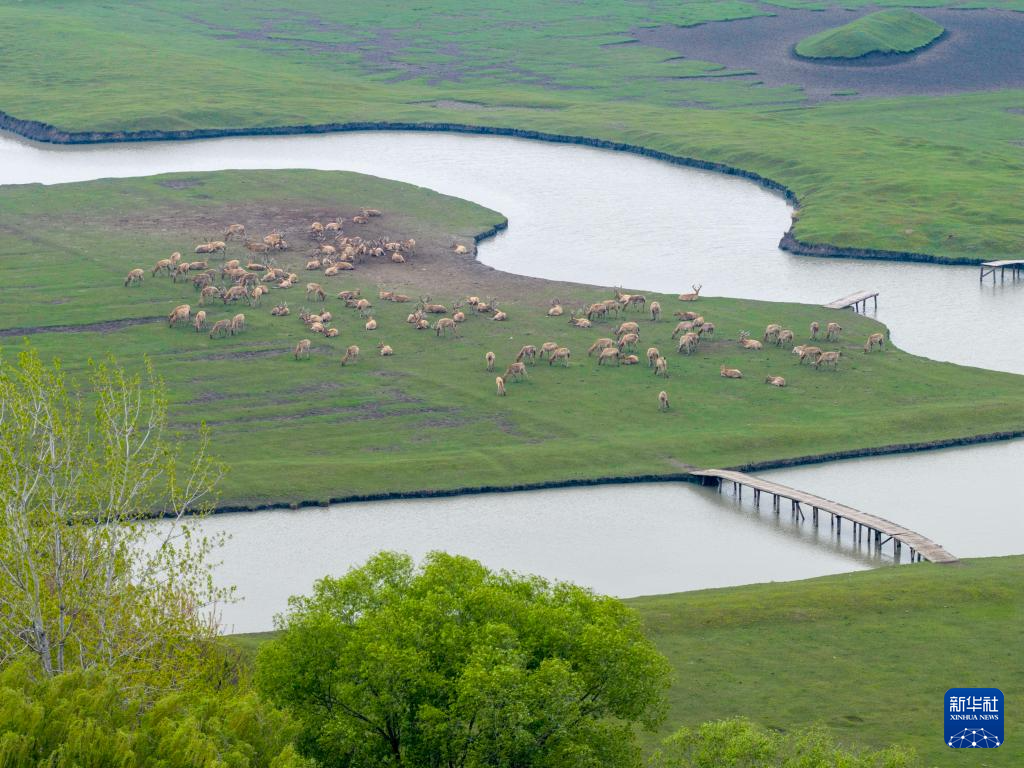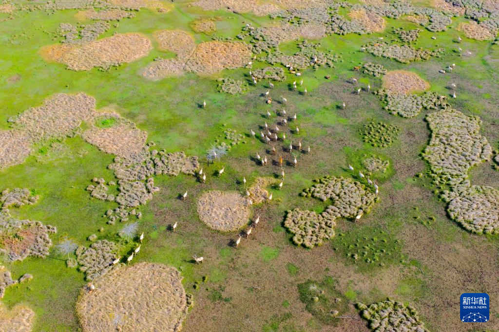 4月15日,麋鹿在江苏东台条子泥湿地栖息觅食(无人机照片)。新华社发(孙家录摄)