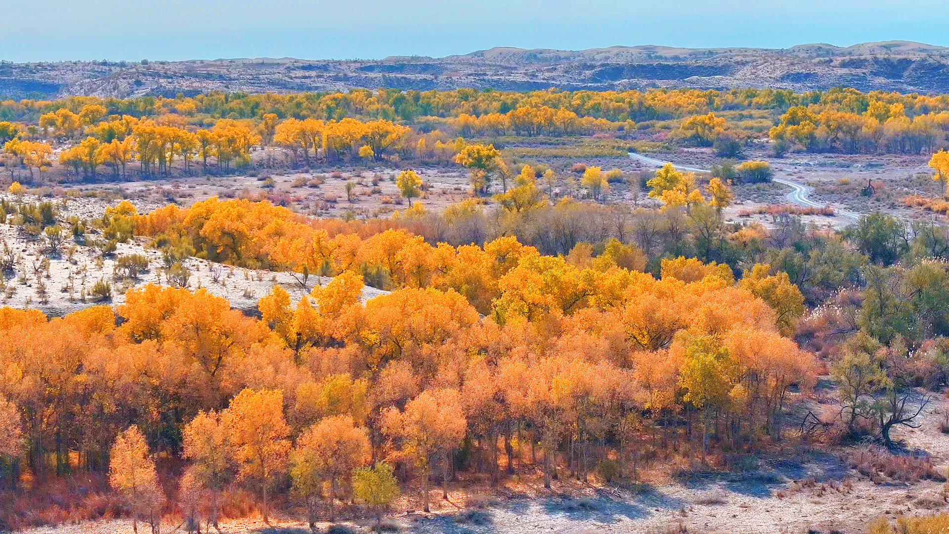 胡杨林金色的枝叶染秋,沙地为底,尽显苍凉壮美。