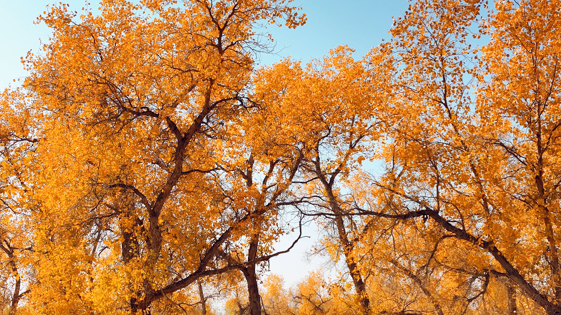胡杨林金黄的枝叶在蓝天映衬下绚烂夺目。