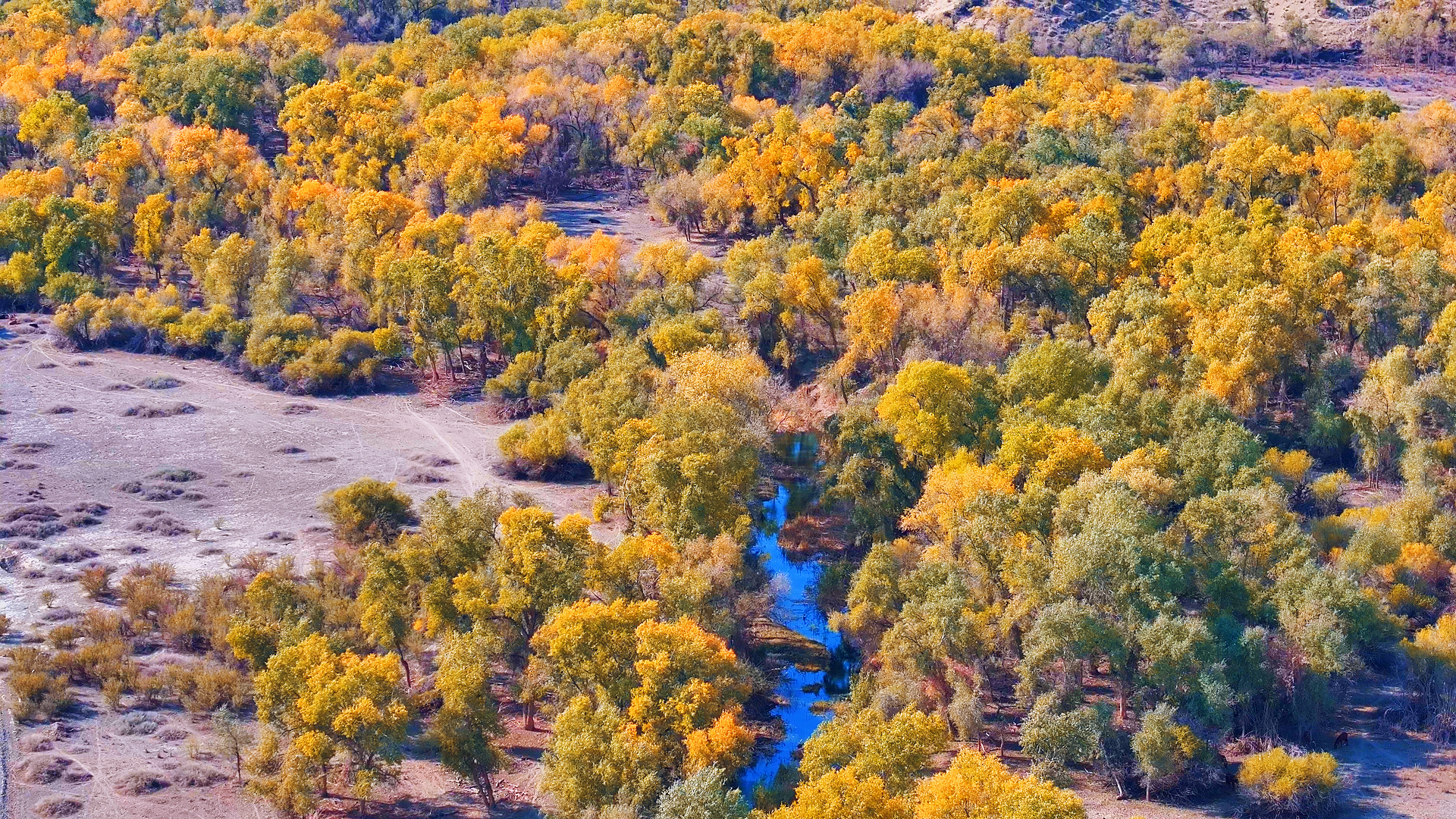 胡杨林间,一条碧蓝溪流蜿蜒穿行,仿佛金色锦缎上镶了一道蓝边。