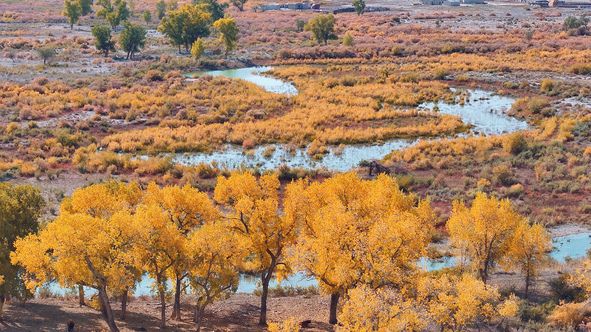 金黄胡杨林环绕碧蓝水域,红黄相间的植被铺展如调色盘,夕阳下河水闪出银白光带。