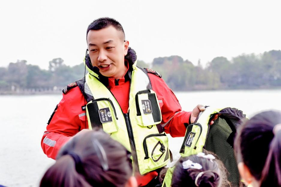 “大家一定要记住,救生衣不是装饰品,关键时刻能保命!”湘湖救援大队副大队长李波一边细心讲解,一边手把手演示着救生衣的正确穿法。孩子们立刻穿上荧光救生衣,排着整齐的队伍有序登上巡逻艇。巡逻艇破浪前行,凉风扑面,大家忍不住惊呼:“原来这就是争分夺秒!”“这么快的速度,救援人员就是勇士啊!”