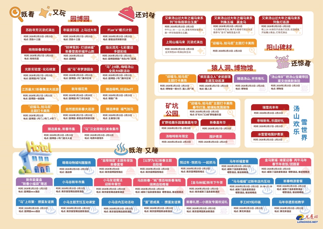 据了解,此次活动覆盖江苏园博园、阳山碑材、猿人洞、矿坑公园、汤山欢乐雪世界、汤山文旅酒店群等六大板块,推出多项特色活动,满足游客对年味、新意、热闹与松弛的全方位需求。