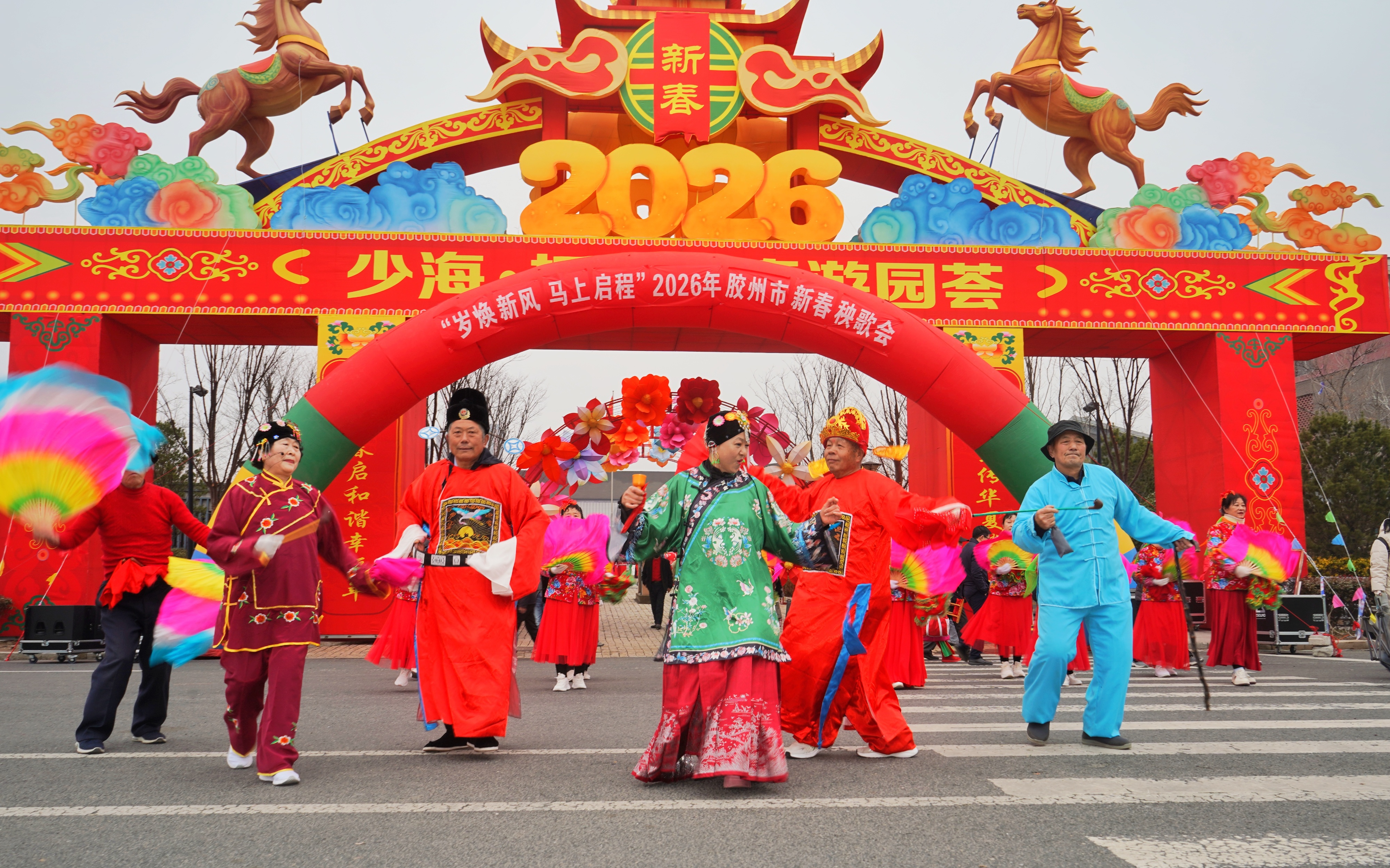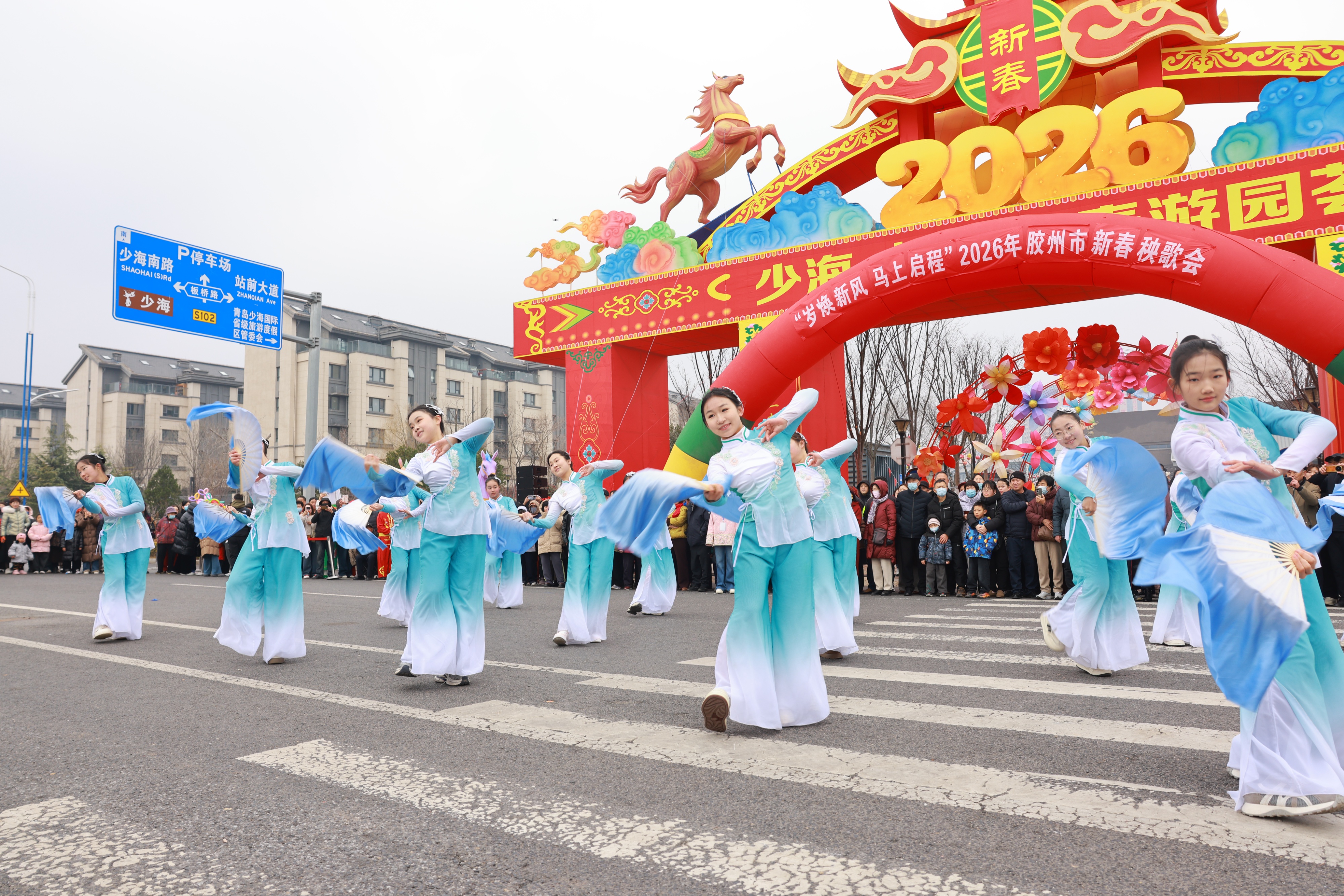 上午9时30分,“岁焕新风马上启程”2026年胶州市新春秧歌会集中展演正式开始,胶州秧歌在这座城市欢腾起舞。作为“胶州秧歌之乡”的胶州市胶东街道,此次特意组织了2支传统胶州秧歌队伍亮相,73岁的国家级非遗传承人吴英民带着女儿与弟子们率先登场,男刚女柔“三弯九动十八态”的经典扭姿、鼓子滑稽幽默的神态,瞬间点燃现场气氛。